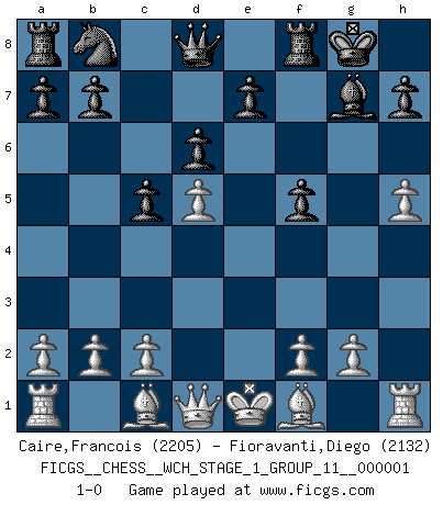 Last move : 1-0 2006 September 14 14:50:13 [Event "FICGS__CHESS__WCH_STAGE_1_GROUP_11__000001"] [Site "FICGS"] [Date "2006.07.01"] [Round "1"] [White "Caire,Francois"] [Black "Fioravanti,Diego"] [Result "1-0"] [WhiteElo "2205"] [BlackElo "2132"] 1.d4 c5 2.d5 f5 3.Nc3 Nf6 4.e4 fxe4 5.Nge2 g6 6.Ng3 Bg7 7.Ncxe4 Nxe4 8.Nxe4 d6 9.h4 Bf5 10.Ng3 O-O 11.Nxf5 gxf5 12.h5 1-0 Old Benoni : Mujannah formation Kingside Castling by player Black (move 10) Player White won this chess game. Follow this game move after move (download)Many have become Chess Masters, no one has become the Master of Chess. (Siegbert Tarrasch) Mein Name ist Rustam Kamsky. Sie haben meinen Sohn belästigt. Bereiten Sie sich aufs Sterben vor. (Rustam Kamsky) Yo siempre he tenido un ligero sentimiento de lástima por una persona que no tiene conocimiento del Ajedrez. (Siegbert Tarrasch) Des points faibles ou des trous dans la position de l'adversaire doivent être occupés par des pièces et non pas par des pions. (Siegbert Tarrasch) Cactus - It is depressed cucumber. (Ilmars Cirulis)