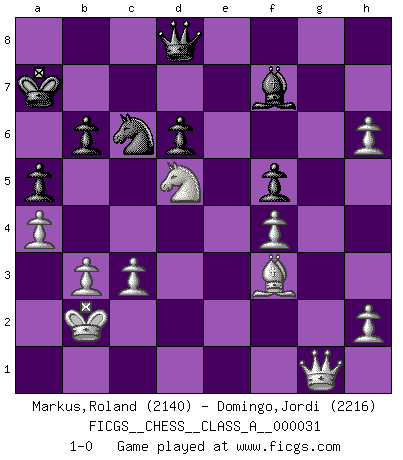 Last move : 1-0 2008 July 11 19:31:27 [Event "FICGS__CHESS__CLASS_A__000031"] [Site "FICGS"] [Date "2007.11.17"] [Round "1"] [White "Markus,Roland"] [Black "Domingo,Jordi"] [Result "1-0"] [WhiteElo "2140"] [BlackElo "2216"] 1.e4 e5 2.Nf3 f5 3.Nxe5 Qf6 4.Nc4 fxe4 5.Nc3 Qg6 6.d3 Bb4 7.Bd2 Bxc3 8.Bxc3 Nf6 9.Bxf6 gxf6 10.Ne3 Kd8 11.dxe4 Qxe4 12.Qd2 Nc6 13.O-O-O d6 14.Bc4 Bd7 15.Rhe1 Kc8 16.g3 a5 17.f4 Qe7 18.Nd5 Qd8 19.Qc3 Rf8 20.a3 Kb8 21.Bb5 h5 22.b3 Rf7 23.Re3 f5 24.Rde1 Rf8 25.Kb2 Rf7 26.a4 Qf8 27.Be2 Qh6 28.Bf3 h4 29.Re8+ Ka7 30.Qe3+ b6 31.Rxa8+ Kxa8 32.Nxc7+ Kb7 33.Nd5 Qh8+ 34.c3 Qd8 35.gxh4 Ka7 36.h5 Rf8 37.Qg1 Rg8 38.Qf2 Be8 39.Rg1 Bf7 40.Rxg8 Bxg8 41.Qg1 Bf7 42.h6 1-0 Latvian counter-gambit Queenside Castling by player White (move 13) Player White won this chess game. Follow this game move after move (download)Every Chess master was once a beginner. (Chernev) Mein erstes Ziel war nicht, die Partie zu gewinnen, sondern eine Figur zu opfern. -- der junge (Wilhelm Steinitz) Fischer era un maestro de claridad y un Rey del posicionamiento astuto. Sus oponentes podían ver hacia donde se dirigía pero eran impotentes para detenerlo. (Bruce Pandolfini) Votre seul travail dans les ouvertures est d'obtenir un milieu de partie jouable. (Lajos Portish) Imagination is more important than knowledge. Knowledge is limited. Imagination encircles the world. (Albert Einstein)