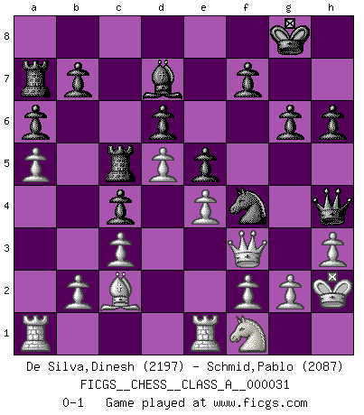 Last move : 0-1 2008 July 8 2:38:21 [Event "FICGS__CHESS__CLASS_A__000031"] [Site "FICGS"] [Date "2007.11.17"] [Round "1"] [White "De Silva,Dinesh"] [Black "Schmid,Pablo"] [Result "0-1"] [WhiteElo "2197"] [BlackElo "2087"] 1.e4 e5 2.Nf3 Nc6 3.Bc4 Nf6 4.d3 Bc5 5.c3 d6 6.O-O O-O 7.Bb3 a6 8.Nbd2 Ba7 9.h3 h6 10.Re1 Nh5 11.Nf1 Qf6 12.Be3 Nf4 13.d4 Ne7 14.Ng3 Neg6 15.Kh2 c5 16.d5 Bd7 17.a4 Rfc8 18.a5 c4 19.Bc2 Nh4 20.Nxh4 Qxh4 21.Qf3 g6 22.Bxa7 Rxa7 23.Nf1 Rc5 0-1 This chess game has been lost on time (started : 2007.11.17 11:37:30) Two knights defense (Modern Bishop's Opening) Kingside Castling by player White (move 6) Kingside Castling by player Black (move 6) Player Black won this chess game. Follow this game move after move (download)You sit at the board and suddenly your heart leaps. Your hand trembles to pick up the piece and move it. But what Chess teaches you is that you must sit there calmly and think about whether it's really a good idea and whether there are other better ideas. (Stanley Kubrick) Charakterschwächen offenbaren sich normalerweise während einer Schachpartie. (Garry Kasparov) No hay precio que sea tan grande por la cabellera del Rey enemigo. (Koblentz) Le génie consiste à savoir transgresser les règles au moment opportun. (Teichmann) Lottery : A tax on people who are bad at math. (Author unknown)