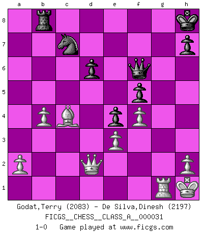 Last move : 1-0 2008 June 8 23:55:9 [Event "FICGS__CHESS__CLASS_A__000031"] [Site "FICGS"] [Date "2007.11.17"] [Round "1"] [White "Godat,Terry"] [Black "De Silva,Dinesh"] [Result "1-0"] [WhiteElo "2083"] [BlackElo "2197"] 1.e4 c5 2.Nf3 Nc6 3.d4 cxd4 4.Nxd4 Nf6 5.Nc3 e5 6.Ndb5 d6 7.Bg5 a6 8.Na3 b5 9.Bxf6 gxf6 10.Nd5 f5 11.Bd3 Be6 12.O-O Bxd5 13.exd5 Ne7 14.c3 Bg7 15.Qh5 e4 16.Be2 O-O 17.Nc2 f4 18.Qg5 f5 19.Rfd1 f3 20.gxf3 Kh8 21.Kh1 Be5 22.f4 Rg8 23.Qh4 Bg7 24.Ne3 Rb8 25.Rg1 b4 26.cxb4 Bxb2 27.Rab1 Rxg1+ 28.Kxg1 Bd4 29.Kh1 Qf8 30.Bxa6 Bxe3 31.fxe3 Nxd5 32.Qe1 Qg7 33.Qd2 Nc7 34.Bc4 Qf6 35.Rg1 1-0 This chess game has been lost on time (started : 2007.11.17 11:37:30) Sicilian : Pelikan (Lasker/Sveshnikov) variation Kingside Castling by player White (move 12) Kingside Castling by player Black (move 16) Player White won this chess game. Follow this game move after move (download)Without error there can be no brilliancy. (Emanuel Lasker) Über Frauen: Chess is better. (Robert James Fischer) Los problemas de Ajedrez exigen del compositor las mismas virtudes que caracterizan todo el arte de valor: originalidad, invención, concisión, armonía, complejidad e insinceridad explendida. (Vladimir Nabokov) Il (Jacob Murray) ne joue pas pour le bon coup, mais pour le meilleur. (Eloi Relange) He who is a good ruler must first have been ruled. (Aristotle)