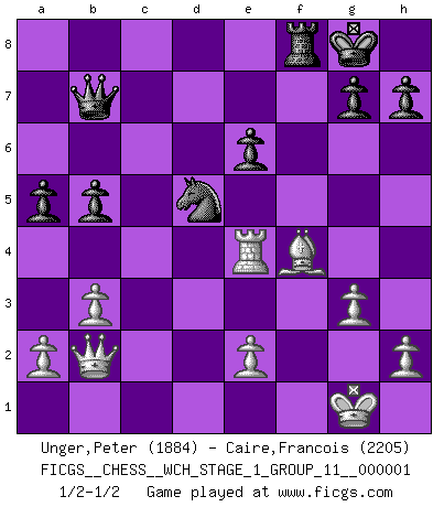 Last move : 1/2-1/2 2006 July 18 22:0:33 [Event "FICGS__CHESS__WCH_STAGE_1_GROUP_11__000001"] [Site "FICGS"] [Date "2006.07.01"] [Round "1"] [White "Unger,Peter"] [Black "Caire,Francois"] [Result "1/2-1/2"] [WhiteElo "1884"] [BlackElo "2205"] 1.d4 Nf6 2.Nf3 e6 3.c4 b6 4.g3 Ba6 5.b3 Bb7 6.Bg2 Bb4+ 7.Bd2 a5 8.O-O O-O 9.Qc2 c5 10.dxc5 Bxc5 11.Nc3 Na6 12.Rad1 d5 13.cxd5 Nb4 14.Qb2 Nbxd5 15.Na4 Ne4 16.Bc1 Bxf2+ 17.Rxf2 b5 18.Rd4 f5 19.Ng5 Nxg5 20.Nc5 Qc7 21.Nxb7 Ne4 22.Bxe4 fxe4 23.Rxf8+ Rxf8 24.Rxe4 Qf7 25.Bf4 Qxb7 1/2-1/2 Queen's pawn game Kingside Castling by player White (move 8) Kingside Castling by player Black (move 8) This chess game ended in a draw. Follow this game move after move (download)Castle early and often. (Rob Sillars) Der Schachmeister von Heute braucht Courage, einen Killerinstinkt, Ausdauer und Arroganz. (Larry Evans) Las ideas audaces son como las piezas del Ajedrez que avanzan hacia adelante. Ellas pueden ser vencidas, pero también pueden iniciar una partida victoriosa. (Goethe) Il a essayé de se convaincre qu'il pourrait empêcher toutes les erreurs et ne jamais perdre. L'horreur ! Gary Kasparov au sujet de Robert Fischer. Without enthusiasm, virtue functions not at all, and vice only poorly. (Mignon McLaughlin, The Neurotic's Notebook, 1960)