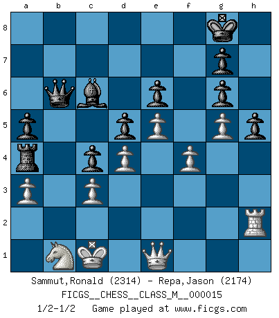 Last move : 1/2-1/2 2009 January 24 9:35:20 [Event "FICGS__CHESS__CLASS_M__000015"] [Site "FICGS"] [Date "2007.11.18"] [Round "1"] [White "Sammut,Ronald"] [Black "Repa,Jason"] [Result "1/2-1/2"] [WhiteElo "2314"] [BlackElo "2174"] 1.e4 e6 2.d4 d5 3.Nc3 Nf6 4.Bg5 Bb4 5.e5 h6 6.Bd2 Bxc3 7.bxc3 Ne4 8.Qg4 Kf8 9.Bd3 Nxd2 10.Kxd2 c5 11.h4 Nc6 12.Rh3 c4 13.Be2 Bd7 14.Rg3 Rg8 15.Qf4 Qb6 16.Bh5 Be8 17.Kc1 Qa5 18.a3 Ne7 19.Ne2 Nf5 20.Rh3 Qd8 21.Kb2 Rh8 22.Rg1 Rc8 23.g4 Nxh4 24.Qc1 Rc6 25.Ka2 Ra6 26.Rgh1 Ng6 27.Bxg6 fxg6 28.Rf3+ Ke7 29.g5 h5 30.Qd2 Qa5 31.Qc1 Rf8 32.R1h3 Ba4 33.Rxf8 Kxf8 34.Kb1 Ke8 35.Rf3 Qd8 36.Ng1 Qe7 37.Rh3 Kf8 38.Nf3 Kg8 39.Nh2 Be8 40.Ka2 b5 41.Nf1 Ra4 42.f4 a5 43.Nd2 b4 44.Nb1 Bc6 45.Rh2 Qa7 46.Qe3 Qb7 47.Qc1 Qe7 48.Qe3 Qf8 49.Rh4 Qb8 50.Qe1 b3+ 51.Kb2 bxc2 52.Kxc2 Qb3+ 53.Kc1 Qb7 54.Rh2 Qb6 1/2-1/2 French : MacCutcheon, Lasker variation This chess game ended in a draw. Follow this game move after move (download)Blessed be the memory of him who gave the world this immortal game. (A. G. Gardiner) Ich habe kein Problem mit Frauen, sondern nur mit dem Niveau ihres Schachspiels (Judith Polgar) Un Peón pasado es un criminal, quién debe ser mantenido bajo candado y llave. Leves medidas, tales como vigilancia policiaca, no son suficientes. (Aaron Nimzovich) Si je n'étais pas joueur d'échecs, je serais le meilleur dans quelque chose d'autre. (Anatoli Karpov) When I took office, only high energy physicists had ever heard of what is called the World Wide Web... Now even my cat has its own page. (Bill Clinton, 1996)