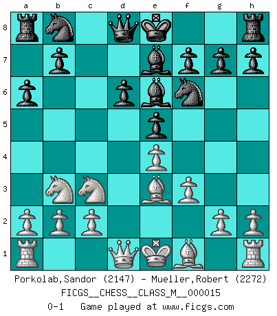 Last move : 0-1 2008 January 22 19:33:4 [Event "FICGS__CHESS__CLASS_M__000015"] [Site "FICGS"] [Date "2007.11.18"] [Round "1"] [White "Porkolab,Sandor"] [Black "Mueller,Robert"] [Result "0-1"] [WhiteElo "2147"] [BlackElo "2272"] 1.e4 c5 2.Nf3 d6 3.d4 cxd4 4.Nxd4 Nf6 5.Nc3 a6 6.Be3 e5 7.Nb3 Be6 8.f3 Be7 0-1 This chess game has been lost on time (started : 2007.11.18 10:8:51) Sicilian : Najdorf, Byrne (English) attack Player Black won this chess game. Follow this game move after move (download)Fischer sacrificed virtually everything most of us weakies (to use his term) value, respect, and cherish, for the sake of an artful, often beautiful board game, for the ambivalent privilege of being its greatest master. (Paul Kollar) Es ist im Leben wie im Schachspiel. Wir entwerfen einen Plan, dieser bleibt jedoch bedingt durch das, was im Schachspiel dem Gegner, im Leben dem Schicksal zu tun belieben wird. (Arthur Schopenhauer) El Ajedrez es una hermosa aventura. (Bent Larsen) Les échecs sont utiles à l'exercice de la faculté de penser et à celle de l'imagination. Car nous devons posséder une méthode élaborée pour atteindre des buts partout où nous devons conduire notre raison. (Leibnitz) A generalist learns less and less about more and more until he knows nothing about everything. (Author unknown)