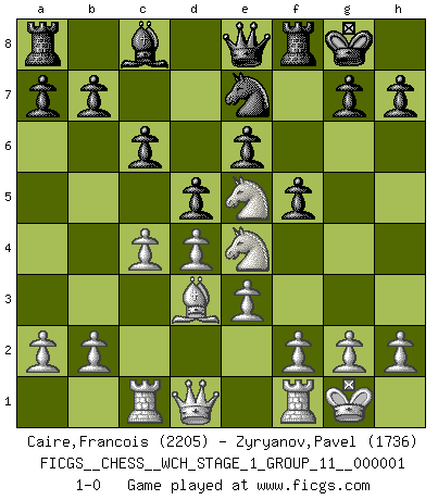 Last move : 1-0 2006 October 6 17:5:46 [Event "FICGS__CHESS__WCH_STAGE_1_GROUP_11__000001"] [Site "FICGS"] [Date "2006.07.01"] [Round "1"] [White "Caire,Francois"] [Black "Zyryanov,Pavel"] [Result "1-0"] [WhiteElo "2205"] [BlackElo "1736"] 1.d4 Nf6 2.c4 e6 3.Nc3 d5 4.Bg5 Be7 5.Nf3 O-O 6.e3 Nc6 7.Rc1 Ne4 8.Bxe7 Nxe7 9.Bd3 f5 10.O-O c6 11.Ne5 Qe8 12.Nxe4 1-0 This chess game has been lost on time (started : 2006.07.01 16:14:28) Queen's pawn game Kingside Castling by player Black (move 5) Kingside Castling by player White (move 10) Player White won this chess game. Follow this game move after move (download)A Chess game is divided into three stages: the first, when you hope you have the advantage, the second when you believe you have an advantage, and the third... when you know you're going to lose ! (Savielly Tartakower) Im Schach gewinnt jeder. Hat man Freunde am Spiel - und das ist die Hauptsache - ist auch der Verlust einer Partie kein Unglück. (David Bronstein) En manos de Fischer's, una diminuta ventaja teórica es tan buena como tener una Reina de ventaja. (Isaac Kashdan) Karpov est une pièce de musée. (Garry Kasparov) It is the aim of the modern school, not to treat every position according to one general law, but according to the principle inherent in the position. (Richard Reti)