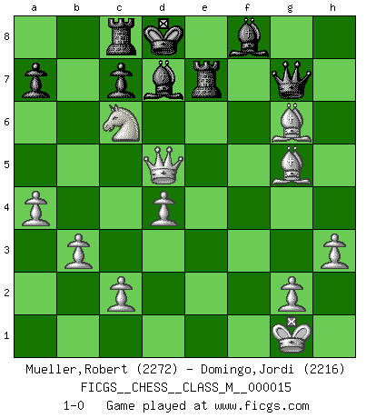 Last move : 1-0 2008 April 14 21:22:24 [Event "FICGS__CHESS__CLASS_M__000015"] [Site "FICGS"] [Date "2007.11.18"] [Round "1"] [White "Mueller,Robert"] [Black "Domingo,Jordi"] [Result "1-0"] [WhiteElo "2272"] [BlackElo "2216"] 1.e4 e5 2.Nf3 f5 3.Nxe5 Qf6 4.d4 d6 5.Nc4 fxe4 6.Nc3 Qg6 7.f3 exf3 8.Qxf3 Nf6 9.Bd3 Qg4 10.Qe3+ Be7 11.O-O Qh5 12.Nb5 Na6 13.h3 Kd8 14.a4 Re8 15.Bd2 Bd7 16.Qg3 Bf8 17.Rf4 Kc8 18.Raf1 Qf7 19.b3 Qe6 20.Bf5 Qe7 21.Bxh7 d5 22.Ne5 Nh5 23.Qg6 Nf6 24.Rxf6 gxf6 25.Rxf6 Qg7 26.Rxa6 bxa6 27.Qxa6+ Kd8 28.Qb7 Rc8 29.Bg5+ Re7 30.Bg6 Bxb5 31.Qxd5+ Bd7 32.Nc6+ 1-0 Latvian counter-gambit Kingside Castling by player White (move 11) Player White won this chess game. Follow this game move after move (download)Chess is a cold bath for the mind. (Sir John Simon) Pläne sind die Träume des Verständigen. (Ernst Freiherr von Feuchtersleben) Bendita sea la memoria de aquel que dio al mundo este juego inmortal. (A. G. Gardiner) Les échecs c'est le défi de l'alpiniste, toujours plus haut, prêt à tout pour monter à l'assaut du Roi ennemi. Les échecs, c'est de la musique en mouvement, un ballet majestueux pour les yeux. C'est de la poésie composée par les fantômes du passé qui au même titre que Rimbaud ou Verlaine méritent notre admiration. Les échecs, c'est de la peinture ou le moindre mouvement modifie le tableau pour en faire un Picasso ou un Van Gogh. Les échecs, c'est tout et rien, c'est la vie et la mort. Jjulie33 sur le forum de France-Echecs. Political correctness is subjecting us to gross incompetence. (Johann Piek)