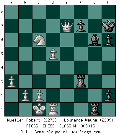 Last move : 0-1 2008 July 30 16:54:0 [Event "FICGS__CHESS__CLASS_M__000015"] [Site "FICGS"] [Date "2007.11.18"] [Round "1"] [White "Mueller,Robert"] [Black "Lowrance,Wayne"] [Result "0-1"] [WhiteElo "2272"] [BlackElo "2209"] 1.e4 c5 2.Nf3 d6 3.d4 cxd4 4.Nxd4 Nf6 5.Nc3 g6 6.Be3 Bg7 7.f3 O-O 8.Qd2 Nc6 9.Bc4 Bd7 10.O-O-O a6 11.h4 b5 12.Bb3 Na5 13.h5 b4 14.Nd5 Nxb3+ 15.Nxb3 Nxd5 16.exd5 Rc8 17.Kb1 Bf5 18.Rc1 gxh5 19.Bd4 Bg6 20.Bxg7 Kxg7 21.Nd4 Qd7 22.f4 e5 23.Nc6 Rfe8 24.Qxb4 exf4 25.Qxf4 Re2 26.Rhf1 Rce8 27.g3 h6 28.a3 Kh7 29.Nb4 R8e4 30.Qf3 R2e3 31.Qf6 Rxg3 32.Nxa6 h4 33.Nb4 Qe7 34.Qf2 R4e3 35.Qf4 h3 36.Nc6 Qg5 37.Qxd6 Ref3 38.Rfd1 h2 39.Qe7 Qxc1+ 40.Kxc1 Rg1 0-1 Sicilian : Dragon, Yugoslav attack, 7...O-O Kingside Castling by player Black (move 7) Queenside Castling by player White (move 10) Player Black won this chess game. Follow this game move after move (download)With or without the title, Bobby Fischer was unquestionably the greatest player of his time. (Burt Hochberg) Als ich elf wurde, wurde ich einfach gut. (Robert James Fischer) Ciertamente el estado mental actual de Bobby Fischer es una tragedia. Uno de los mas grandes jugadores de Ajedrez del mundo -el orgullo y pena del Ajedrez Americano. (Frank Brady) La tactique, c'est ce que vous faites quand il y a quelque chose à faire; la stratégie, c'est ce que vous faites quand il n'y a rien à faire. (Savielli Tartacower) Life is verb, not a noun. (Charlotte Perkins Gilman)