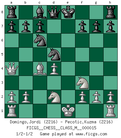 Last move : 1/2-1/2 2007 November 29 21:46:55 [Event "FICGS__CHESS__CLASS_M__000015"] [Site "FICGS"] [Date "2007.11.18"] [Round "1"] [White "Domingo,Jordi"] [Black "Pecotic,Kuzma"] [Result "1/2-1/2"] [WhiteElo "2216"] [BlackElo "2216"] 1.e4 e5 2.Nf3 Nc6 3.Bc4 Bc5 4.c3 Nf6 5.d4 exd4 6.cxd4 Bb4+ 7.Bd2 Bxd2+ 8.Nbxd2 d5 9.exd5 Nxd5 10.Qb3 Na5 11.Qa4+ Nc6 12.Qb3 Na5 13.Qa4+ Nc6 1/2-1/2 Giuoco Piano This chess game ended in a draw. Follow this game move after move (download)Modern Chess is too much concerned with things like Pawn structure. Forget it, Checkmate ends the game. (Nigel Short) Woher wissen wir, daß der Neanderthaler Blindschach gespielt hat? -- Bei Ausgrabungen wurden keine Schachbretter und Figuren gefunden. (Anonymous) Durante una competencia de Ajedrez, un Maestro de Ajedrez deberá ser una combinación de presa de caza y un Monge. (Alexander Alekhine) Ce qui caractérise les parties de combat, c'est que si le défenseur a constamment de difficiles problèmes à résoudre, l'attaquant doit chercher sans relâche de nouvelles possibilités d'attaque. (Koblentz) The arrogant army will lose certainly the battle. (Chinese proverb)