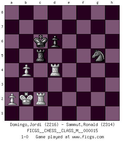Last move : 1-0 2009 February 6 23:14:12 [Event "FICGS__CHESS__CLASS_M__000015"] [Site "FICGS"] [Date "2007.11.18"] [Round "1"] [White "Domingo,Jordi"] [Black "Sammut,Ronald"] [Result "1-0"] [WhiteElo "2216"] [BlackElo "2314"] 1.e4 c5 2.Nf3 d6 3.d4 cxd4 4.Nxd4 Nf6 5.Nc3 a6 6.Be3 e5 7.Nb3 Be6 8.f3 Nbd7 9.g4 b5 10.g5 b4 11.Ne2 Nh5 12.Qd2 a5 13.Ng3 Nxg3 14.hxg3 a4 15.Nc1 Qa5 16.f4 g6 17.Nd3 Bg7 18.f5 gxf5 19.exf5 Bxf5 20.Nxb4 Rb8 21.c3 a3 22.b3 e4 23.O-O-O Rc8 24.c4 Qe5 25.Bd4 Qxd4 26.Qxd4 Bxd4 27.Rxd4 Rg8 28.Rh5 Rg7 29.Bh3 Bxh3 30.Rxh3 Rxg5 31.Rxe4+ Ne5 32.Nd5 Kf8 33.Rxh7 Rc5 34.Rh8+ Kg7 35.Reh4 Rxg3 36.R4h7+ Kg6 37.Rh6+ Kf5 38.Rf6+ Ke4 39.Rh4+ Kd3 40.Rh1 Rxd5 41.cxd5 Rg2 42.Kb1 Ng4 43.Rf3+ Ke4 44.Rxf7 Rb2+ 45.Ka1 Rd2 46.Re1+ Kxd5 47.Rfe7 Kc5 48.R7e2 Rd3 49.Re4 Nf2 50.Ra4 Rd2 51.Rxa3 Nd3 52.Rg1 Nb4 53.Ra5+ Kb6 54.Ra8 Kb7 55.Ra4 Nc6 56.Rag4 Kb6 57.R1g2 Rd5 58.Kb2 Ne5 59.Rh4 Nd3+ 60.Kc3 Ne5 61.Rd4 Rc5+ 62.Kb2 Kc6 63.Rgd2 Nf7 64.Rc2 Ng5 65.b4 1-0 Sicilian : Najdorf, Byrne (English) attack Queenside Castling by player White (move 23) 10 pieces endgame at move 46 : White KRRPP , Black KRNPP WHITE : King + 2 Rooks 2 Pawns BLACK : King + 1 Rook 1 Knight 2 Pawns 9 pieces endgame at move 51 : White KRRPP , Black KRNP WHITE : King + 2 Rooks 2 Pawns BLACK : King + 1 Rook 1 Knight 1 Pawn Player White won this chess game. Follow this game move after move (download)Chess is not like life... it has rules ! (Mark Pasternak) Wenn Capablanka heute auf der Schachbühne erscheinen würde, hätte er ein halbes Jahr gebraucht um sich die Schachtheorie anzueignen. Und dann hätte er alles und jeden besiegt. (Mikhail Moiseyevich Botvinik) Es el objetivo de la escuela moderna no tratar cada posición de acuerdo a una regla general, sino de acuerdo al principio inherente en la posición. (Richard Reti) Il (Jacob Murray) ne joue pas pour le bon coup, mais pour le meilleur. (Eloi Relange) Being number two sucks. (Andre Agassi)