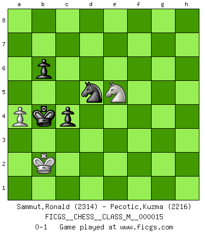 Last move : 0-1 2009 March 19 10:51:59 [Event "FICGS__CHESS__CLASS_M__000015"] [Site "FICGS"] [Date "2007.11.18"] [Round "1"] [White "Sammut,Ronald"] [Black "Pecotic,Kuzma"] [Result "0-1"] [WhiteElo "2314"] [BlackElo "2216"] 1.e4 c5 2.Nf3 e6 3.d4 cxd4 4.Nxd4 Nf6 5.Nc3 d6 6.g4 h6 7.h4 Nc6 8.Rg1 h5 9.gxh5 Nxh5 10.Bg5 Nf6 11.Qd2 Qb6 12.Nb3 Bd7 13.O-O-O a6 14.Qe2 Qc7 15.Rg3 Be7 16.Rgd3 O-O-O 17.f3 Kb8 18.Qf2 Ne5 19.R3d2 Bc6 20.f4 Ng6 21.Bg2 Ng4 22.Qg3 Nf6 23.f5 Ne5 24.fxe6 fxe6 25.Nd4 Nh5 26.Qe1 Bxg5 27.hxg5 Bd7 28.Rf2 g6 29.Bh3 Nf4 30.Bf1 Rdf8 31.Qd2 Nh5 32.Rh2 Ng3 33.Rxh8 Rxh8 34.Bg2 Qb6 35.Qf2 Nh5 36.Bf1 Rh7 37.Kb1 Rf7 38.Qe1 Rf8 39.Be2 Nf4 40.Qd2 Nxe2 41.Qxe2 Rf4 42.Qh2 Rg4 43.Qh8+ Ka7 44.Qf6 Nc4 45.Nb3 Rg1 46.a3 Rxd1+ 47.Nxd1 Qg1 48.Qf2+ Qxf2 49.Nxf2 Kb6 50.Nd4 Ne5 51.c3 a5 52.Kc2 a4 53.Kd2 Nc4+ 54.Kc1 e5 55.Nf3 Kb5 56.Nh4 Be8 57.Ng4 Na5 58.Nf6 Nb3+ 59.Kd1 Bf7 60.Nf3 Nc5 61.Kd2 Kc4 62.Kc2 Ne6 63.Nd5 Be8 64.Nd2+ Kc5 65.Nf3 Bb5 66.Kd2 Bc6 67.Nf6 Kc4 68.Kc2 Nf4 69.Nd2+ Kc5 70.Nf3 Bb5 71.Kd2 Kc4 72.Kc2 Nh3 73.Nh7 Nf2 74.Nf6 b6 75.Nd2+ Kc5 76.b4+ axb3+ 77.Nxb3+ Kc6 78.Kd2 Nh3 79.Nh7 Bc4 80.Na1 Bg8 81.Nf6 Be6 82.Nh7 Kb5 83.Nc2 Bc8 84.Ne1 Ka4 85.Nc2 Bb7 86.Ne3 Kb3 87.Ng4 Bxe4 88.Ngf6 Bc6 89.Ng8 Kc4 90.Ne7 Be4 91.a4 Kc5 92.Nf6 Bc6 93.Nh7 Nf4 94.Nf6 d5 95.Ng4 e4 96.Ke3 Nh3 97.Nxc6 Kxc6 98.c4 Nxg5 99.Ne5+ Kd6 100.Nxg6 dxc4 101.Kd4 e3 102.Kxe3 Ne6 103.Kd2 Kc5 104.Kc3 Nc7 105.Ne5 Nd5+ 106.Kb2 Kb4 0-1 Sicilian : Anderssen variation Queenside Castling by player White (move 13) Queenside Castling by player Black (move 16) 10 pieces endgame at move 98 : White KNPP , Black KNPPPP WHITE : King + 1 Knight 2 Pawns BLACK : King + 1 Knight 4 Pawns 9 pieces endgame at move 100 : White KNPP , Black KNPPP WHITE : King + 1 Knight 2 Pawns BLACK : King + 1 Knight 3 Pawns 8 pieces endgame at move 100 : White KNP , Black KNPPP WHITE : King + 1 Knight 1 Pawn BLACK : King + 1 Knight 3 Pawns 7 pieces endgame at move 102 : White KNP , Black KNPP WHITE : King + 1 Knight 1 Pawn BLACK : King + 1 Knight 2 Pawns Player Black won this chess game. Follow this game move after move (download)No Chess Grandmaster is normal; they only differ in the extent of their madness. (Viktor Korchnoi) Mein erstes Ziel war nicht, die Partie zu gewinnen, sondern eine Figur zu opfern. -- der junge (Wilhelm Steinitz) Solo los afeminados hacen el Enroque. (Rob Sillars) On croit qu'il y a plus de mauvais joueurs que de bons joueurs, c'est faux : Il y a autant de joueurs qui gagnent que de joueurs qui perdent. (Philippe Geluck) The general who wins the battle makes many calculations in his temple before the battle is fought. The general who loses makes but few calculations beforehand. (Sun Tzu)