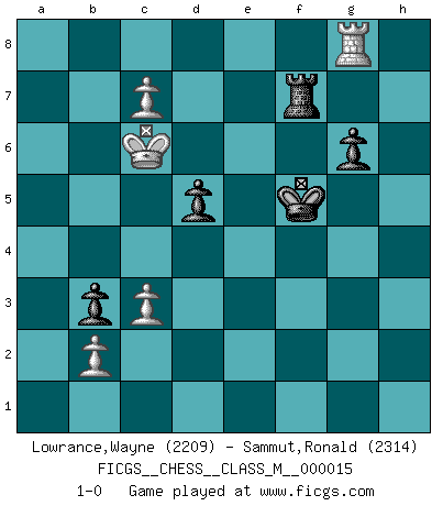 Last move : 1-0 2008 September 27 12:13:41 [Event "FICGS__CHESS__CLASS_M__000015"] [Site "FICGS"] [Date "2007.11.18"] [Round "1"] [White "Lowrance,Wayne"] [Black "Sammut,Ronald"] [Result "1-0"] [WhiteElo "2209"] [BlackElo "2314"] 1.e4 c5 2.Nf3 d6 3.d4 cxd4 4.Nxd4 Nf6 5.Nc3 a6 6.Bg5 e6 7.Qf3 h6 8.Be3 e5 9.Nb3 b5 10.h3 Nbd7 11.Bd3 b4 12.Nd5 Nxd5 13.exd5 Nf6 14.O-O Bb7 15.Be4 a5 16.a3 Be7 17.axb4 axb4 18.Rxa8 Bxa8 19.Ra1 O-O 20.Na5 Nxe4 21.Qxe4 f5 22.Qc4 f4 23.Bd2 f3 24.Nc6 Bxc6 25.dxc6 d5 26.Qg4 Bc5 27.Bxh6 Rf7 28.Bd2 fxg2 29.Qe6 Bb6 30.Be1 b3 31.c3 Qf6 32.Ra8+ Kh7 33.Qxf6 Rxf6 34.Rc8 Kg6 35.Kxg2 Rd6 36.f4 exf4 37.Kf3 Re6 38.Bd2 Be3 39.Bxe3 fxe3 40.Ke2 Kg5 41.h4+ Kg4 42.h5 Kg5 43.c7 Re7 44.h6 g6 45.h7 Rxh7 46.Kxe3 Kg4 47.Kd4 Rd7 48.Kc5 Rf7 49.Kc6 Kf5 50.Rg8 1-0 Sicilian : Najdorf, 6...e6 Kingside Castling by player White (move 14) Kingside Castling by player Black (move 19) 10 pieces endgame at move 46 : White KRPPP , Black KRPPP WHITE : King + 1 Rook 3 Pawns BLACK : King + 1 Rook 3 Pawns Player White won this chess game. Follow this game move after move (download)Not all artists are Chess players, but all Chess players are artists. (Marcel Duchamp) Wer sich die Fähigkeit anerziehen will im Schach selbstständig zu denken, der muß alles meiden, was leblos ist: ausgeklügelte Theorien, die sich auf sehr wenige Beispiele und eine Menge Hirngespinste stützen. (Emanuel Lasker) Bobby es la celebridad menos entendida y malinterpretada que camina el la faz de esta tierra. (Yasser Seirawan) J'ai vu le vaincu d'Echecs jouer des années durant dans l'espoir de la fête de la victoire. Car tu es plus riche de ce qu'elle existe si même elle n'est point pour toi. Ainsi de la perle du fond des mers. (Antoine de Saint-Exupéry) The real danger is not that computers will begin to think like men, but that men will begin to think like computers. (Sydney J. Harris)