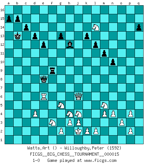 Last move : 1-0 2008 January 10 19:41:38 [Event "FICGS__BIG_CHESS__TOURNAMENT__000015"] [Site "FICGS"] [Date "2007.11.18"] [Round "1"] [White "Watts,Art"] [Black "Willoughby,Peter"] [Result "1-0"] [WhiteElo ""] [BlackElo "1592"] 1.n2-n4 j15-h13 2.j2-h4 m15-m13 3.d2-d4 n15-n13 4.h1-q9 p16-o14 5.b2-b3 d15-d13 6.c1-p13 o16-b4 7.c2-c3 b4-k12 8.e2-e3 q15-q14 9.p13-o14 p15-o14 10.o1-g8 l16-n14 11.f1-c4 l15-l14 12.p1-o3 e15-e13 13.m2-m4 f16-b12 14.l1-m2 b12-m2 15.m1-m2 m16-m14 16.q1-m1 m13-m12 17.g8-n14 o15-n14 18.g1-f3 b16-c14 19.k1-l3 g16-f14 20.h2-j4 c16-h11 21.o3-n5 l14-l13 22.m2-m3 h11-l14 23.q9-q11 o14-o13 24.m3-p3 l14-m13 25.c4-m13 m14-m13 26.p3-p14 k12-m10 27.p14-n14 n13-n12 28.n14-o14 e13-e12 29.o14-o13 m13-m16 30.m1-m3 h16-k14 31.m3-o3 m10-p13 32.q11-p12 n12-n11 33.h4-k5 e16-e13 34.f3-h4 h13-k12 35.b1-d2 e13-k13 36.d2-f3 a16-e16 37.j1-j2 e16-e13 38.e1-m1 k12-m13 39.o3-o5 m12-m11 40.m1-m3 n11-n10 41.m3-o3 m13-n11 42.p12-p6 n11-o13 43.o5-o13 c14-d16 44.f3-g5 l13-l12 45.o13-k13 e13-k13 46.g5-j6 q16-p16 47.p6-n8 m16-m13 48.a1-m1 p13-n15 49.o3-p3 p16-p3 50.q2-p3 g15-g14 51.p3-p4 k14-a5 52.n8-c8 c15-c14 53.a2-a4 k13-f13 54.h4-f3 f13-f8 55.c8-c4 k15-k13 56.j6-g5 m13-o13 57.o2-o3 n15-q12 58.k5-h4 o13-o8 59.m1-m3 f8-c8 60.c4-j10 a5-c3 61.j10-c16 c3-b3 62.c16-d16 j16-j15 63.d16-c15 g14-g13 64.c15-f15 c8-b8 65.l3-m5 b3-a4 66.n5-m7 o8-f8 67.f15-p6 q12-p13 68.p6-p9 h15-k14 69.m7-n9 b8-b9 70.p9-o10 a4-c2 71.o10-o15 k14-m15 72.n9-o11 p13-n11 73.o11-n13 j15-k14 74.n13-m15 k14-j13 75.m15-k16 j13-h13 76.o15-n15 n11-k14 77.n15-f8 f14-g12 78.k16-l14 c2-f2 79.m3-k3 f2-e3 80.f8-f15 h13-h12 81.k3-k12 h12-g11 82.f15-c15 g11-f11 83.c15-f15 f11-e11 84.k12-g12 e3-e10 85.g12-g6 e11-d12 86.f15-f14 d12-c12 87.g6-c6 c12-b13 88.f14-h14 k14-h12 89.h14-d14 e10-e11 90.d14-j14 e11-e8 91.j14-j6 b9-f9 92.c6-e6 1-0 Follow this game move after move (download)By playing at Chess then, we may learn: First: Foresight... Second: Circumspection... Third: Caution... And lastly, we learn by Chess the habit of not being discouraged by present bad appearances in the state of our affairs, the habit of hoping for a favorable chance, and that of persevering in the secrets of resources. (Benjamin Franklin) Die Partien sind immer verschieden, die Interviews immer die gleichen. (Garry Kasparov) El Ajedrez es un cuento de Hadas de las 1001 metidas de pata. (Savielly Tartakower) Si je n'étais pas joueur d'échecs, je serais le meilleur dans quelque chose d'autre. (Anatoli Karpov) That's absurd. I love it. (Gregory House, House M.D.)