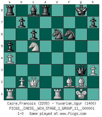 Last move : 1-0 2006 September 15 11:45:55 [Event "FICGS__CHESS__WCH_STAGE_1_GROUP_11__000001"] [Site "FICGS"] [Date "2006.07.01"] [Round "1"] [White "Caire,Francois"] [Black "Yuvarlak,Ugur"] [Result "1-0"] [WhiteElo "2205"] [BlackElo "1400"] 1.d4 Nf6 2.c4 g6 3.g3 Bg7 4.Bg2 O-O 5.Nf3 d6 6.O-O Nbd7 7.Nc3 e5 8.h3 c6 9.e4 Re8 10.Be3 exd4 11.Nxd4 Nc5 12.Qc2 Qe7 13.Rfe1 Bd7 14.Nb3 Ne6 15.f4 a5 16.a4 Bc8 17.c5 dxc5 18.e5 Nd7 19.Ne4 Rd8 20.Nd6 f6 21.f5 gxf5 22.Nxf5 Qf7 23.Nxg7 Qxg7 24.exf6 Nxf6 25.Nxc5 Qxg3 26.Bf2 1-0 King's Indian : 3.g3 Kingside Castling by player Black (move 4) Kingside Castling by player White (move 6) Player White won this chess game. Follow this game move after move (download)Pawns: they are the soul of this game, they alone form the attack and defense. (Philidor) Ein bischen Romantik kann weder im Schach noch in der Liebe schaden. Also versuche ich mich ab und zu daran zu erinnern. (Nigel Short) El Ajedrez era la lengua materna de Capablanca. (Reti) Donnez-moi un Cavalier en 6e et je gagnerais toutes mes parties. (Steinitz) Hold em is to stud what chess is to checkers. (Johnny Moss)