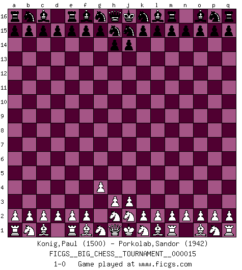 Last move : 1-0 2007 December 21 20:31:43 [Event "FICGS__BIG_CHESS__TOURNAMENT__000015"] [Site "FICGS"] [Date "2007.11.18"] [Round "1"] [White "Konig,Paul"] [Black "Porkolab,Sandor"] [Result "1-0"] [WhiteElo "1500"] [BlackElo "1942"] 1.g2-g4 1-0 Follow this game move after move (download)In a gambit you give up a Pawn for the sake of getting a lost game. (Samuel Standige Boden) Wenn Dein Gegner dir ein Remis anbietet, versuch herauszufinden, weshalb er glaubt schlechter zu stehen. (Nigel Short) El Ajedrez es tan inspirador que yo no creo que un buen jugador sea capaz de tener un pensamiento malo durante una partida. (Wilhelm Steinitz) D'abord les bases : Jouez et étudiez, puis étudiez et jouez, ensuite jouez et étudiez, puis étudiez et jouez. Deuxièmement : Donnez toujours le meilleur de vous-même ! (Ken Smith) But they are useless. They can only give you answers. (Pablo Picasso, about computers)