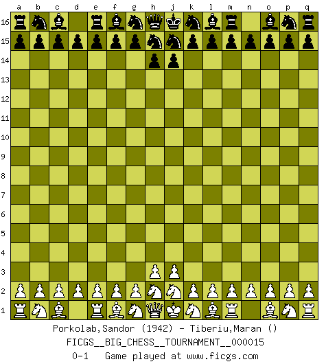 Last move : 0-1 2007 December 21 20:32:34 [Event "FICGS__BIG_CHESS__TOURNAMENT__000015"] [Site "FICGS"] [Date "2007.11.18"] [Round "1"] [White "Porkolab,Sandor"] [Black "Tiberiu,Maran"] [Result "0-1"] [WhiteElo "1942"] [BlackElo ""] 0-1 Follow this game move after move (download)When I have White, I win because I am white; When I have Black, I win because I am Bogolyubov. (Bogolyubov) Der Traum, für den ich lebe, ist der von einem freien Russland. Viele mögen sagen: Russland hat doch ein Parlament, einen gewählten Präsidenten. Aber ich spüre, dass in meiner Heimat die Angst wiederkehrt. Eine Angst, sich frei zu äußern, bestimmte Dinge zu tun (Garry Kasparov) Los Peones son el alma de una partida de Ajedrez. (Francois Andre Danican Philidor) C'est la seule position que je connaisse où les deux camps sont mals. Propos prêtés à V. Anand. Statistics can be made to prove anything - even the truth. (Author unknown)