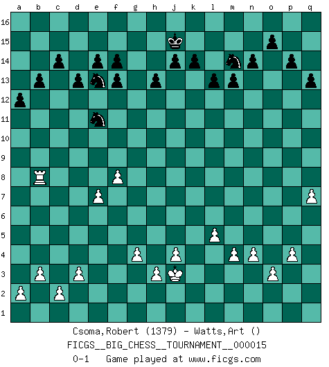 Last move : 0-1 2008 June 2 11:25:1 [Event "FICGS__BIG_CHESS__TOURNAMENT__000015"] [Site "FICGS"] [Date "2007.11.18"] [Round "1"] [White "Csoma,Robert"] [Black "Watts,Art"] [Result "0-1"] [WhiteElo "1379"] [BlackElo ""] 1.m2-m4 b15-b14 2.l1-o4 d15-d14 3.e2-e4 c16-b15 4.f1-c4 n15-n14 5.j2-k4 b16-c14 6.h1-l4 j15-l14 7.c4-k11 g15-g14 8.d2-d3 h16-c11 9.k11-c4 a15-a13 10.l4-f9 g16-f14 11.f9-o9 p16-o14 12.o4-j9 o16-n15 13.b2-b3 m15-m14 14.h2-g4 h14-h13 15.c1-h6 c11-f11 16.j9-k8 m14-m13 17.c4-h9 f11-f9 18.n2-n3 f9-b9 19.h9-l6 b9-o9 20.l6-o9 f16-k12 21.g1-f3 k16-m15 22.f3-g5 o14-n12 23.o1-c12 c14-e13 24.c12-o1 n15-o14 25.e4-e5 m15-l13 26.b1-d2 l16-m15 27.p1-q3 k12-h14 28.k8-g11 l14-j13 29.o9-l6 b15-l6 30.k4-l6 f14-e12 31.g11-n5 m15-e8 32.k2-k3 e8-c6 33.f2-f3 h15-f14 34.h6-o12 n12-m14 35.o12-n11 l13-j12 36.d2-c4 m14-l12 37.n11-k8 f14-g12 38.c4-a5 c6-g10 39.l6-j7 h14-b8 40.j7-g8 m16-m14 41.g8-e9 g10-n4 42.l2-l4 n4-l2 43.m1-l1 l2-o5 44.a5-c6 b8-g13 45.o2-o3 m14-k14 46.p2-p4 o5-h11 47.c6-e7 g13-d10 48.e9-c8 d10-g7 49.n3-n4 j12-k10 50.g5-j6 k10-h9 51.j6-g7 o14-g7 52.k8-e13 g12-e13 53.e7-f5 g7-l11 54.a1-b1 l11-k12 55.l4-l5 h11-d7 56.c8-e7 k12-n9 57.e1-e2 k14-k3 58.o1-n2 e13-g12 59.j1-j2 k3-k12 60.g4-f6 d7-g10 61.n2-b13 e16-g16 62.k1-l3 e12-c13 63.f6-g8 c15-c14 64.b13-c12 d14-d13 65.c12-a10 q16-m16 66.g8-e9 g10-e12 67.e7-f9 a16-c16 68.f9-d10 e12-f13 69.e9-f11 m16-m14 70.q3-p5 m14-k14 71.l1-k1 j16-h15 72.k1-k12 n9-k12 73.f11-h12 k12-f8 74.h12-f13 g14-f13 75.a10-b9 e15-e14 76.b9-e6 f8-d10 77.e6-h9 d10-l3 78.q1-k1 k14-k1 79.b1-k1 g12-j11 80.h9-f7 k15-k14 81.k1-k3 l3-f8 82.e5-e6 c13-e12 83.e6-e7 f8-b12 84.k3-k7 b12-d14 85.n5-d14 e12-d14 86.k7-o7 l12-n13 87.p5-n6 j11-l12 88.n6-p7 g16-g5 89.g2-g4 c16-g16 90.p7-n8 d14-e12 91.f3-f4 g5-g11 92.n8-p9 e12-g13 93.f5-h6 g13-h11 94.f7-d5 h11-k10 95.h6-g8 g11-g8 96.d5-g8 g16-g8 97.p9-o11 g8-q8 98.j2-j1 q8-j8 99.j3-j4 j8-j11 100.o11-n13 l12-n13 101.q2-q4 j11-o11 102.o7-o11 n13-o11 103.j1-j2 k10-h11 104.j2-j3 j13-g14 105.e2-e6 g14-e13 106.e6-q6 q15-q14 107.q6-p6 o11-p13 108.q4-q5 l15-l13 109.q5-q6 h15-j15 110.q6-q7 p15-p14 111.p6-p8 h11-j13 112.p8-q8 q14-q13 113.q8-p8 p13-n12 114.p8-o8 n12-m14 115.o8-b8 b14-b13 116.f4-f5 f15-f14 117.f5-f6 a13-a12 118.f6-f7 j13-g12 119.f7-f8 g12-e11 0-1 This big chess game has been lost on time (started : 2007.11.18 20:24:38) Follow this game move after move (download)Only sissies Castle. (Rob Sillars) Du weisst es gibt ein Problem mit Computern und Fernschach, wenn jeder eine Rating von 2450 hat. (John Christen Knudsen) Tu no necesitas jugar muy bien, únicamente ayudar a tu oponenet a que juegue muy mal. (Genrikh Chepukaitis) Je ne crois pas en la psychologie, je crois aux bons coups. (Robert Fischer) It is not titles that honor men, but men that honor titles. (Niccolo Machiavelli)
