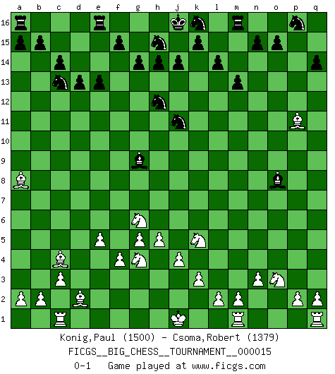 Last move : 0-1 2008 April 20 20:17:59 [Event "FICGS__BIG_CHESS__TOURNAMENT__000015"] [Site "FICGS"] [Date "2007.11.18"] [Round "1"] [White "Konig,Paul"] [Black "Csoma,Robert"] [Result "0-1"] [WhiteElo "1500"] [BlackElo "1379"] 1.g2-g4 e15-e13 2.f2-f4 f16-c13 3.o2-o4 m15-m13 4.p1-o3 l16-o13 5.c2-c3 c13-j7 6.d2-d4 p15-p14 7.h3-h4 o16-q14 8.g4-g5 o13-g6 9.j3-j4 d15-d14 10.h1-c6 g6-b1 11.a1-b1 c15-c14 12.e2-e4 j15-k13 13.h4-h5 h16-o10 14.c6-f6 o10-e1 15.f6-q16 e1-e4 16.b1-a1 p14-p13 17.c1-d2 p13-p12 18.f1-c4 l15-l14 19.q16-g7 g15-g14 20.a1-c1 c16-h11 21.g7-e5 e4-e5 22.d4-e5 q14-k8 23.j2-k4 k8-o4 24.n2-n3 o4-m6 25.k4-l6 j7-h8 26.o1-h7 q15-q14 27.k2-k3 h11-g10 28.l6-j5 g16-f14 29.h7-j6 p12-p11 30.j5-k7 g10-k7 31.j6-k7 k13-h12 32.g1-h3 f14-g12 33.h3-j5 g12-j11 34.k1-l3 j11-k9 35.l3-k5 m6-o8 36.h2-g4 k9-m8 37.k7-h9 m8-k9 38.j5-g6 h8-g9 39.l1-h4 k9-j11 40.h9-e12 d14-d13 41.e12-a8 b16-a14 42.h4-p11 a14-c13 0-1 This big chess game has been lost on time (started : 2007.11.18 20:24:38) Follow this game move after move (download)Is Bobby Fischer quite sane ? (Salo Flohr) Immer nach dem besten Zug zu suchen ist ziemlich unpraktisch. (Nigel Short) El Ajedrez tiene tanto misterio como las mujeres. (Purdy) La victoire dans une partie d'Echecs appartient la plupart du temps à celui qui voit un peu plus loin que l'adversaire. (Lasker) Is not life a hundred times too short to bore ourselves ? (Friedrich Nietzsche)