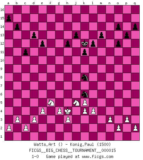 Last move : 1-0 2008 April 29 8:55:33 [Event "FICGS__BIG_CHESS__TOURNAMENT__000015"] [Site "FICGS"] [Date "2007.11.18"] [Round "1"] [White "Watts,Art"] [Black "Konig,Paul"] [Result "1-0"] [WhiteElo ""] [BlackElo "1500"] 1.p2-p3 g15-g13 2.o1-p2 c15-c13 3.e2-e4 b16-c14 4.j2-k4 b15-b14 5.f1-e2 f15-f13 6.e2-k7 c16-b15 7.d2-d3 e15-e13 8.c1-j7 e16-d16 9.b1-c3 c14-a13 10.m2-m3 d15-d13 11.p2-l6 g16-f14 12.l1-o4 e13-e12 13.p1-o3 f16-d14 14.o4-d14 d16-d14 15.j7-k8 d14-e14 16.h1-n6 g13-g12 17.k7-o11 l15-l14 18.k8-n11 h16-g15 19.e1-e3 f13-f12 20.l6-m7 h14-h13 21.e3-g3 n15-n13 22.n11-k8 g15-j13 23.k8-f12 o15-o14 24.f12-g11 h13-h12 25.g11-b6 j13-g13 26.o11-l8 g13-e11 27.q1-o1 j14-j13 28.l8-g12 f14-g12 29.m7-g12 e14-g14 30.g12-f13 g14-g3 31.f2-g3 e11-g13 32.n6-g12 g13-g12 33.f13-g12 a16-g16 34.g12-f13 g16-g3 35.j1-h1 g3-g6 36.c3-d5 o16-f8 37.a1-f1 f8-b12 38.b6-a7 g6-a6 39.a7-c5 p16-q14 40.d5-b4 a6-a11 41.c5-m14 j16-h16 42.m14-k16 h15-k16 43.f13-e14 h16-h15 44.f1-f15 h15-j14 45.f15-f16 k16-h15 46.e14-g12 j14-k14 47.f16-f7 a11-g11 48.f7-k7 k14-l15 49.g12-a6 k15-k13 50.a6-l16 m16-l16 51.g1-f3 l16-g16 52.g2-g4 j15-h13 53.h1-j2 q14-o13 54.k1-l3 k13-k12 55.f3-h4 l14-l13 56.m1-f1 g16-f16 57.f1-f7 g11-j11 58.k4-h5 f16-f11 59.o1-f1 q16-f16 60.k7-l7 m15-m14 61.f7-f11 j11-f11 62.f1-f11 f16-f11 63.l7-q7 q15-q14 64.h2-f3 f11-l11 65.h4-k5 b15-a14 66.o3-m4 l11-l12 67.q7-o7 l12-o12 68.o7-o12 n13-o12 69.b2-b3 l15-l14 70.f3-h4 l13-l12 71.k2-k4 l14-l13 72.b4-d5 h15-g13 73.j2-k3 c13-c12 74.l3-j4 p15-p13 75.h4-f5 b12-c13 76.n2-n3 m14-m13 77.j4-g3 c12-c11 78.l2-l3 c13-m4 79.k5-m4 a14-m3 80.k3-k2 m3-g8 81.d5-e7 g8-f7 82.f5-d6 f7-j10 83.g3-f5 a13-c12 84.j3-j4 o13-n11 85.m4-k5 j10-m7 86.k5-h6 h13-j11 87.h5-k6 m7-n8 88.k2-j3 j11-k9 89.h6-k5 n8-k5 90.j4-k5 k9-j7 91.j3-j4 n11-m9 92.l3-l4 g13-h11 93.k6-h7 c12-e11 94.h7-k6 h11-j9 95.f5-h6 k12-k11 96.d6-f5 e11-g10 97.j4-j5 l13-k12 98.j5-j6 j7-l8 99.k6-l8 j9-l8 100.h6-k7 m9-k8 101.j6-j5 g10-j9 102.k7-j9 l8-j9 103.e7-g6 j9-h7 104.j5-h4 h7-k6 105.g6-j5 1-0 This big chess game has been lost on time (started : 2007.11.18 20:24:38) Follow this game move after move (download)Chess teaches you to control the initial excitement you feel when you see something that looks good and it trains you to think objectively when you're in trouble. (Stanley Kubrick) Als er Schachweltmeister wurde ließ er praktisch alle stärksten Sovietspieler für sich arbeiten. Wenn ein auch nur mittelmässiger Meister ein Spezialist für eine bestimmte Eröffnung war, wurde er von Karpov gerufen. Das wurde alles geheim gehalten. (Mikhail Moiseyevich Botvinik) El hombre es un frívolo, una creatura engañosa y como un jugador de Ajedrez, se preocupa mas por el proceso de obtener su meta que de la meta por sí misma. (Dostoyevsky) J'ai vu le vaincu d'Echecs jouer des années durant dans l'espoir de la fête de la victoire. Car tu es plus riche de ce qu'elle existe si même elle n'est point pour toi. Ainsi de la perle du fond des mers. (Antoine de Saint-Exupéry) There are two major products that came out of Berkeley: LSD and UNIX. We do not believe this is to be a coincidence. (Jeremy S. Anderson)