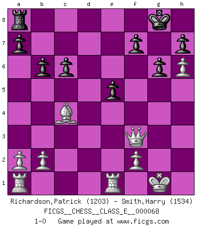 Last move : 1-0 2007 December 22 18:3:6 [Event "FICGS__CHESS__CLASS_E__000068"] [Site "FICGS"] [Date "2007.11.18"] [Round "1"] [White "Richardson,Patrick"] [Black "Smith,Harry"] [Result "1-0"] [WhiteElo "1203"] [BlackElo "1534"] 1.d4 Nf6 2.c4 g6 3.Nc3 Bg7 4.e4 d6 5.Nf3 O-O 6.Be2 e6 7.O-O Re8 8.h3 e5 9.dxe5 Nh5 10.g4 Bxe5 11.gxh5 Bxh3 12.Re1 Qd7 13.Nxe5 Rxe5 14.Bf4 Re8 15.Nd5 Rxe4 16.Nf6+ Kg7 17.Nxd7 Nxd7 18.h6+ Kg8 19.Qd2 b6 20.Qc3 Ne5 21.Bxe5 dxe5 22.Qxh3 Rxc4 23.Bxc4 c6 24.Qf3 1-0 King's Indian : 6.Be2 Kingside Castling by player Black (move 5) Kingside Castling by player White (move 7) Player White won this chess game. Follow this game move after move (download)A bad day of Chess is better than any good day at work. (Anonymous) Bis jetzt ist Weiß einer wohlbekannten Analyse gefolgt. Aber jetzt begeht er einen schrecklichen Fehler: Er beginnt seinen eigenen Kopf zu benutzen. (Siegbert Tarrasch) Un mal día en el Ajedrez, es mejor que cualquier buen día en el trabajo. (Anonymous) La guerre est enfant de la passion, la passion est enfant du narcissisme et le narcissisme est l'enfant. (...) Une autre partie ? (Thibault de Vassal) Gambling : The sure way of getting nothing from something. (Wilson Mizner)