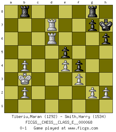 Last move : 0-1 2008 April 11 7:18:41 [Event "FICGS__CHESS__CLASS_E__000068"] [Site "FICGS"] [Date "2007.11.18"] [Round "1"] [White "Tiberiu,Maran"] [Black "Smith,Harry"] [Result "0-1"] [WhiteElo "1292"] [BlackElo "1534"] 1.e4 e5 2.Nf3 Nc6 3.Bc4 Be7 4.d3 Bf6 5.Nc3 Nge7 6.Be3 O-O 7.a3 d6 8.Qd2 a6 9.Nd5 Be6 10.Nxf6+ Kh8 11.Bxe6 fxe6 12.Bh6 Rxf6 13.Bg5 Rf8 14.c3 d5 15.O-O-O dxe4 16.dxe4 Qxd2+ 17.Rxd2 Ng6 18.Rhd1 b5 19.Kb1 Nf4 20.Bxf4 exf4 21.Rd3 a5 22.Nd4 Ne5 23.R3d2 Nc4 24.Rd3 e5 25.Ne6 Rfc8 26.Rd7 Nd6 27.f3 b4 28.Nxc7 Ne8 29.Nxe8 Rxe8 30.axb4 axb4 31.cxb4 Rab8 32.Ka2 h6 33.Kb3 Kh7 34.R1d6 Rg8 0-1 Hungarian defense Kingside Castling by player Black (move 6) Queenside Castling by player White (move 15) Player Black won this chess game. Follow this game move after move (download)Human affairs are like a Chess game: only those who do not take it seriously can be called good players. (Hung Tzu Ch'eng) Intelligenz läßt sich nicht am Weg, sondern nur am Ergebnis feststellen. (Garry Kasparov) ¡Examina movidas que hagan daño! Un buen ojo for movidas desvastantes es mucho mas importante que el conocimiento de principios estratégicos. (Purdy) Dieu déplace le joueur, et celui-ci la pièce. Quel Dieu derrière Dieu commence donc la trame ? Arturo Perez-Reverte (prix de littérature policière 1993). All battles are fought by scared men who'd rather be someplace else. (John Wayne in the movie In harm's way)