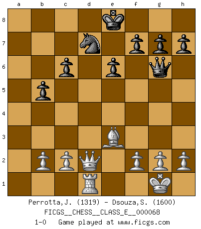 Last move : 1-0 2007 December 9 20:44:5 [Event "FICGS__CHESS__CLASS_E__000068"] [Site "FICGS"] [Date "2007.11.18"] [Round "1"] [White "Perrotta,John Zach"] [Black "Dsouza,Stanislaus"] [Result "1-0"] [WhiteElo "1319"] [BlackElo "1600"] 1.e4 a6 2.d4 b5 3.Bd3 Bb7 4.Nf3 e6 5.O-O c5 6.a4 Nf6 7.dxc5 Be7 8.axb5 axb5 9.Rxa8 Bxc5 10.Ra1 Nxe4 11.Bxe4 Bxe4 12.Nc3 Bc6 13.Qe2 Qb6 14.Ne4 O-O 15.Nxc5 Qxc5 16.Be3 Qf5 17.Nd4 Qg6 18.Nxc6 dxc6 19.Ra8 Nd7 20.Rxf8+ Kxf8 21.Qd2 Ke8 22.Rd1 1-0 St. George (Baker) defense Kingside Castling by player White (move 5) Kingside Castling by player Black (move 14) Player White won this chess game. Follow this game move after move (download)Chess is above all, a fight ! (Emanuel Lasker) Ich verlor meine Bürgerrechte, mein Gehalt wurde mir nicht mehr bezahlt und ich wurde zensiert und durfte nicht mehr ins Ausland reisen. [nach dem Match Fischer-Taimanov 6:0] (Mark Taimanov) Observen a Garry Kasparov. Después de una derrota, invariablemente el gana la próxima partida. Prácticamente hace pedazos a su siguiente oponente. Eso es algo que tenemos que aprender a lograr. (Maurice Ashley) Celui qui prend des risques peut perdre, celui qui n'en prend pas perd toujours. (Xavier Tartacover) Programmer - an organism that turns coffee into software. (Anonymous)