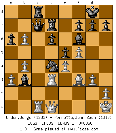 Last move : 1-0 2008 May 3 21:7:53 [Event "FICGS__CHESS__CLASS_E__000068"] [Site "FICGS"] [Date "2007.11.18"] [Round "1"] [White "Orden,Jorge"] [Black "Perrotta,John Zach"] [Result "1-0"] [WhiteElo "1283"] [BlackElo "1319"] 1.e4 c5 2.Nf3 d6 3.d4 cxd4 4.Nxd4 Nf6 5.Nc3 a6 6.Be2 e5 7.Nb3 Nc6 8.O-O Be7 9.f4 Qb6+ 10.Kh1 O-O 11.f5 Rd8 12.Nd5 Nxd5 13.c4 Ne3 14.Bxe3 Qxe3 15.Rf3 Qb6 16.a3 Qc7 17.Rg3 Bf6 18.Rd3 b6 19.Rc1 Bb7 20.Nd2 Rd7 21.b4 Nd4 22.Bf3 Rc8 23.g3 Bc6 24.Nb3 Ba4 25.c5 Bxb3 26.cxb6 1-0 This chess game has been lost on time (started : 2007.11.18 20:35:59) Sicilian : Najdorf, Opovcensky variation Kingside Castling by player White (move 8) Kingside Castling by player Black (move 10) Player White won this chess game. Follow this game move after move (download)In blitz, the Knight is stronger than the Bishop. (Vlastimil Hort) Alles was ich jemals tun will ist Schach spielen. (Robert James Fischer) No es tiempo de jugar al Ajedrez cuando la casa esta en llamas. (Proverbio Italiano) L'ordinateur a tué l'originalité. Il n'y a plus guère d'aventures sur l'échiquier. (Jacob Murray) If you know the enemy and know yourself you need not fear the results of a hundred battles. (Sun Tzu)