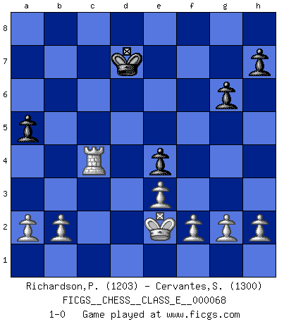 Last move : 1-0 2007 December 29 2:58:27 [Event "FICGS__CHESS__CLASS_E__000068"] [Site "FICGS"] [Date "2007.11.18"] [Round "1"] [White "Richardson,Patrick"] [Black "Cervantes,Sergio"] [Result "1-0"] [WhiteElo "1203"] [BlackElo "1300"] 1.d4 d5 2.c4 e5 3.dxe5 d4 4.Nf3 Bb4+ 5.Bd2 Nc6 6.Bxb4 Be6 7.Bc5 Bxc4 8.Na3 Qd5 9.Bxd4 O-O-O 10.Nxc4 Qxc4 11.e3 Qb4+ 12.Qd2 Qe7 13.Rc1 Nxd4 14.Nxd4 Qxe5 15.Nc6 Rxd2 16.Nxe5 f6 17.Kxd2 fxe5 18.Rc5 e4 19.Bc4 Nf6 20.Re5 Rd8+ 21.Ke2 a6 22.Re7 g6 23.Rf7 Rd6 24.Rd1 b5 25.Rxd6 cxd6 26.Rxf6 bxc4 27.Rxd6 a5 28.Rc6+ Kd7 29.Rxc4 1-0 QGD : Albin counter-gambit Queenside Castling by player Black (move 9) Player White won this chess game. Follow this game move after move (download)Adequate compensation for a sacrifice is having a sound combination leading to a winning position; adequate compensation for a blunder is having your opponent snatch defeat from the jaws of victory. (Bruce A. Moon) Modernes Schach sorgt sich zuviel um Dinge wie Bauernstruktur usw. Vergessen Sie das, Schachmatt beendet das Spiel! (Nigel Short) El Ajedrez es el arte del análisis. (Mikhail Botvinnik) Le joueur d'Echecs qui veut atteindre le top est obligé de développer son propre credo créatif. Alexeï Stepanovicth Souétine. Il est facile d'écrire des livres ! Ce qui est difficile, c'est de jouer ! (Alexeï Stepanovicth Souétine) I live to kill Traxler counterattack. (Ilmars Cirulis)
