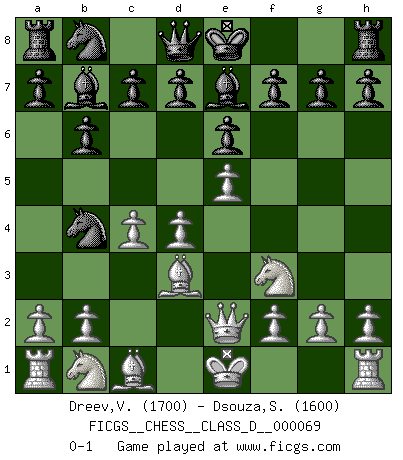 Last move : 0-1 2008 January 18 11:27:13 [Event "FICGS__CHESS__CLASS_D__000069"] [Site "FICGS"] [Date "2007.11.20"] [Round "1"] [White "Dreev,Vladimir"] [Black "Dsouza,Stanislaus"] [Result "0-1"] [WhiteElo "1700"] [BlackElo "1600"] 1.e4 b6 2.d4 Bb7 3.Bd3 e6 4.Nf3 Nf6 5.Qe2 Be7 6.e5 Nd5 7.c4 Nb4 0-1 This chess game has been lost on time (started : 2007.11.20 8:9:49) Owen defense Player Black won this chess game. Follow this game move after move (download)In the perfect Chess combination as in a first-rate short story, the whole plot and counter-plot should lead up to a striking finale, the interest not being allayed until the very last moment. (Yates and Winter) Ich hatte meine größten Erfolge, als ich 47 Jahre alt war. Kasparow war noch nicht mal 42 und hat das Schach schon im Stich gelassen. (Viktor Kortschnoi) No existe un remordimiento como el remordimiento del Ajedrez. (H. G. Wells) Nous vivons dans un monde échiquéen : chaque jour qui passe est un défi à relever. (Philosophe Sasha) Difficult things take a long time, impossible things a little longer. (Author unknown)