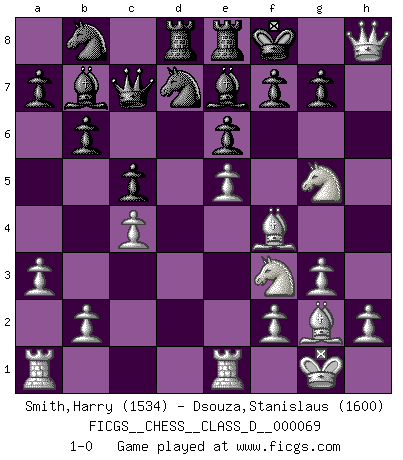 Last move : 1-0 2007 December 25 21:59:2 [Event "FICGS__CHESS__CLASS_D__000069"] [Site "FICGS"] [Date "2007.11.20"] [Round "1"] [White "Smith,Harry"] [Black "Dsouza,Stanislaus"] [Result "1-0"] [WhiteElo "1534"] [BlackElo "1600"] 1.e4 b6 2.Nf3 Bb7 3.g3 e6 4.d3 Nf6 5.Bg2 Be7 6.O-O d6 7.Re1 O-O 8.e5 Nd5 9.d4 Nd7 10.Nbd2 c5 11.Ne4 dxe5 12.dxe5 Qc7 13.c4 Nb4 14.a3 Na6 15.Bf4 Rad8 16.Qc2 Rfe8 17.Neg5 Nab8 18.Qxh7+ Kf8 19.Qh8+ 1-0 Owen defense Kingside Castling by player White (move 6) Kingside Castling by player Black (move 7) Player White won this chess game. Follow this game move after move (download)Good offense and good defense both begin with good development. (Bruce A. Moon) Im Fernschach kannst du während dem Spiel rauchen. (John Christen Knudsen) La única cosa que los jugadores de Ajedrez tienen en común, es el Ajedrez. (Lodewijk Prins) Les réformistes prétendent que les progrès de la théorie conduiront à la disparition des échecs, et qu'il faut, pour leur rendre vie, en remanier les règles. En réalité, qu'exprime cette affirmation? Le mépris de l'intuition, de l'imagination et de tous les autres éléments qui font des échecs un art. (Alexander Alekhine) Knowledge rests not upon truth alone, but upon error also. (Carl G. Jung)