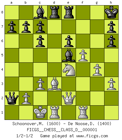 Last move : 1/2-1/2 2006 October 23 15:32:31 [Event "FICGS__CHESS__CLASS_D__000001"] [Site "FICGS"] [Date "2006.04.12"] [Round "1"] [White "Schoonover,Michael"] [Black "De Noose,Daniel"] [Result "1/2-1/2"] [WhiteElo "1600"] [BlackElo "1400"] 1.e4 e5 2.Nf3 Nc6 3.d4 exd4 4.Nxd4 Bc5 5.Nxc6 Qf6 6.Qd2 dxc6 7.Nc3 Bd4 8.f4 Nh6 9.e5 Qh4+ 10.g3 Qd8 11.Ne4 O-O 12.h3 Be6 13.Bd3 Re8 14.Qe2 Qd5 15.g4 Rad8 16.Rf1 Kh8 17.f5 Bc8 18.e6 Be5 19.Bxh6 gxh6 20.O-O-O Qxa2 21.c3 fxe6 1/2-1/2 Scotch game Kingside Castling by player Black (move 11) Queenside Castling by player White (move 20) This chess game ended in a draw. Follow this game move after move (download)Chess is a forcing house where the fruits of character can ripen more fully than in life. (Edward Morgan Foster) Über Kasparov: Es ist offensichtlich, daß er in einem totalitären Staat aufwuchs und deshalb zu diktatorischen Zügen neigt. (Viktor Kortschnoi) El Ajedrez es tan interesante por sí solo, que no es necesario un interés monetario para persuadir a una persona a que lo practique; por lo tanto, nunca se juega por dinero. (Benjamin Franklin) La vie et les Echecs sont tous les deux une lutte constante. (Lasker) The Internet is the first thing that humanity has build that humanity doesn't understand, the largest experiment in anarchy that we have ever had. (Eric Schmidt)