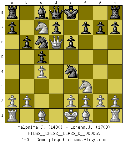 Last move : 1-0 2007 November 26 6:22:12 [Event "FICGS__CHESS__CLASS_D__000069"] [Site "FICGS"] [Date "2007.11.20"] [Round "1"] [White "Malpalma,Joaquim"] [Black "Lorena,Justine Rei"] [Result "1-0"] [WhiteElo "1400"] [BlackElo "1700"] 1.d4 Nf6 2.c4 e6 3.Nf3 c5 4.d5 Be7 5.d6 Bxd6 6.Qxd6 b6 7.Nc3 Nc6 8.Nb5 Ne4 9.Nc7+ 1-0 Queen's pawn game Player White won this chess game. Follow this game move after move (download)Chess is a cold bath for the mind. (Sir John Simon) Ein Isolani verdüstert die Stimmung auf dem ganzen Schachbrett. (Savielly Grigorievitsch Tartakower) El Ajedrez es el juego mas altamente simbólico, pero las agresiones estan por lo tanto aún mas francamente representadas en la partida. Tal vez comenzo como un juego de guerra; Algo como la representación de una batalla en miniatura entre las fuerzas de dos reinos. (Karl Meninger) Dans le domaine de la peinture, de la gravure et de la sculpture, dès la première décennie de notre siècle, les artistes abandonnent la représentation de la partie d'échecs pour se concentrer sur les pièces, sur les échiquiers et sur toutes les variations auxquelles les unes et les autres peuvent donner lieu. On passe en quelque sorte d'un thème social à un thème musical (au sens de la musica médiévale, c'est-à-dire d'une notion qui inclue le rythme, l'harmonie, la construction et la déconstruction, etc.). Graphiquement et picturalement, l'échiquier apparaît comme une structure ouverte, dynamique, d'une richesse infinie, autorisant toutes les combinatoires et débouchant sur des mouvements et des rythmes de nature exponentielle. (Michel Pastoureau) In God we trust, all others we virus scan. (Anonymous)