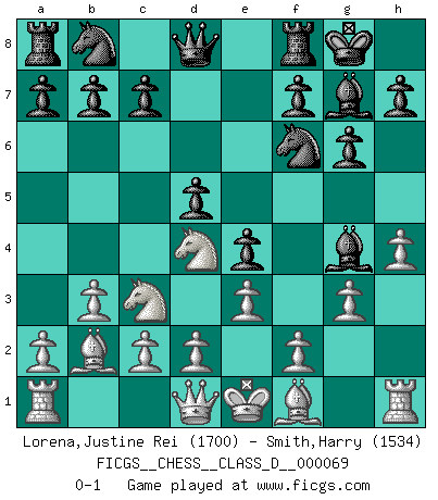 Last move : 0-1 2008 January 6 22:48:50 [Event "FICGS__CHESS__CLASS_D__000069"] [Site "FICGS"] [Date "2007.11.20"] [Round "1"] [White "Lorena,Justine Rei"] [Black "Smith,Harry"] [Result "0-1"] [WhiteElo "1700"] [BlackElo "1534"] 1.Nc3 e5 2.g3 d5 3.e3 Nf6 4.Nf3 e4 5.Nd4 g6 6.b3 Bg7 7.h4 O-O 8.Bb2 Bg4 0-1 This chess game has been lost on time (started : 2007.11.20 8:9:49) Dunst (Sleipner-Heinrichsen) Opening Kingside Castling by player Black (move 7) Player Black won this chess game. Follow this game move after move (download)If one piece is badly posted, the whole game is bad. (Tarrasch) Ja, jede Frau in Holland liebt mich bestimmt, und alle Männer hassen mich. (Loek van Wely) Después de una mala apertura, hay una esperanza en el juego medio. Pero una vez que estas en finales, el momento de la verdad ha llegado. (Edmar Mednis) Vouloir jouer aux échecs contre soi-même est aussi paradoxal que vouloir marcher sur son ombre. (Stefan Zweig) Empty your mind, be formless, shapeless — like water. (Bruce Lee)