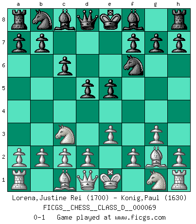 Last move : 0-1 2008 January 8 22:57:46 [Event "FICGS__CHESS__CLASS_D__000069"] [Site "FICGS"] [Date "2007.11.20"] [Round "1"] [White "Lorena,Justine Rei"] [Black "Konig,Paul"] [Result "0-1"] [WhiteElo "1700"] [BlackElo "1630"] 1.Nc3 Nf6 2.g3 d5 3.e3 e5 4.Bg2 c6 0-1 This chess game has been lost on time (started : 2007.11.20 8:9:49) Dunst (Sleipner, Heinrichsen) Opening Player Black won this chess game. Follow this game move after move (download)Good positions don't win games, good moves do. (Gerald Abrahams) Kein Großmeister ist normal. Sie unterscheiden sich nur im Ausmaß Ihrer Verrücktheit. (Viktor Kortschnoi) Tu sabes que vas a perder. Aún cuando tenía la ventaja, yo sabía que iba a perder. - al estar jugando con Fischer (Andrew Soltis) Toute estimation doit être constamment réévaluée. (Jacob Estrin) Warrior pose battles inner weakness and wins focus. You see that there is no war within you. You're on your own side, and you are your own strength. (Terri Guillemets)