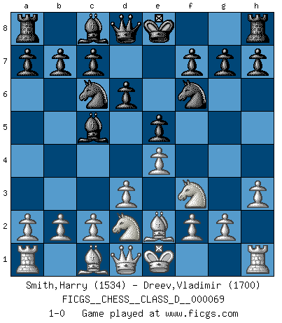 Last move : 1-0 2008 January 19 23:27:46 [Event "FICGS__CHESS__CLASS_D__000069"] [Site "FICGS"] [Date "2007.11.20"] [Round "1"] [White "Smith,Harry"] [Black "Dreev,Vladimir"] [Result "1-0"] [WhiteElo "1534"] [BlackElo "1700"] 1.e4 e5 2.Nf3 Nc6 3.d3 Bc5 4.Nbd2 Nf6 5.h3 d6 6.Be2 1-0 This chess game has been lost on time (started : 2007.11.20 8:9:49) King's pawn game Player White won this chess game. Follow this game move after move (download)As one by one I mowed them down, my superiority soon became apparent. (Jose Capablanca) Wenn ein Kopf und ein Buch zusammenstoßen und es klingt hohl, ist es denn allemal im Buche? (Georg Christoph Lichtenberg) El Ajedrez es el arte del análisis. (Mikhail Botvinnik) Vous savez, camarade Pachman, je n'éprouve pas de plaisir à être ministre, je jouerais plutôt aux échecs comme vous, ou alors ferais une révolution au Venezuela. (Che Guevara à Ludek Pachman, 'Checkmate in Prague', 1975) The Internet is the first thing that humanity has build that humanity doesn't understand, the largest experiment in anarchy that we have ever had. (Eric Schmidt)