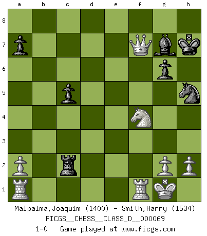 Last move : 1-0 2007 December 22 18:2:53 [Event "FICGS__CHESS__CLASS_D__000069"] [Site "FICGS"] [Date "2007.11.20"] [Round "1"] [White "Malpalma,Joaquim"] [Black "Smith,Harry"] [Result "1-0"] [WhiteElo "1400"] [BlackElo "1534"] 1.c4 Nf6 2.Nc3 g6 3.e4 e5 4.Nf3 d6 5.d4 exd4 6.Nxd4 Bg7 7.f3 O-O 8.Bg5 h6 9.Be3 Nc6 10.Nxc6 bxc6 11.Qd2 Ba6 12.Be2 c5 13.O-O Re8 14.Bxh6 c6 15.Bg5 Nh5 16.Bxd8 Rexd8 17.f4 d5 18.cxd5 Bxe2 19.Nxe2 cxd5 20.exd5 Rd7 21.f5 Rb8 22.fxg6 fxg6 23.Qe3 Rxd5 24.Qe6+ Kh7 25.Qxd5 Rxb2 26.Nf4 Rc2 27.Qf7 1-0 English Opening Kingside Castling by player Black (move 7) Kingside Castling by player White (move 13) Player White won this chess game. Follow this game move after move (download)The hallmark of the artist is simplicity. (Larry Evans) Ein Gewinn durch eine ungenaue Kombination, sei sie auch noch so vorzeigbar, erfüllt mich mit Schaudern. (Wilhelm Steinitz) El Ajedrez es un juego terrible. Si no dominas el centro, tu oponente tiene una posición mas libre. Si tu tienes el centro, entonces realmente tienes algo de que preocuparte. (Siegbert Tarrasch) Je menace de comprendre la position. (Anonyme) Only sick music makes money today. (Friedrich Nietzsche)