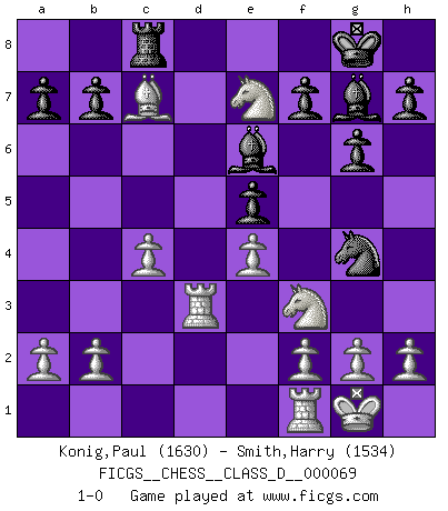 Last move : 1-0 2008 January 27 1:15:36 [Event "FICGS__CHESS__CLASS_D__000069"] [Site "FICGS"] [Date "2007.11.20"] [Round "1"] [White "Konig,Paul"] [Black "Smith,Harry"] [Result "1-0"] [WhiteElo "1630"] [BlackElo "1534"] 1.c4 Nf6 2.Nf3 g6 3.Nc3 Bg7 4.d4 O-O 5.e4 d6 6.Be2 Re8 7.O-O e5 8.dxe5 dxe5 9.Qxd8 Rxd8 10.Bg5 Re8 11.Rad1 Na6 12.Rd2 Nc5 13.Bd3 Ng4 14.Nd5 Rd8 15.Bxd8 Nxd3 16.Rxd3 Be6 17.Bxc7 Rc8 18.Ne7+ 1-0 English Opening Kingside Castling by player Black (move 4) Kingside Castling by player White (move 7) Player White won this chess game. Follow this game move after move (download)Not only will I predict his triumph over Botvinnik, but I'll go further and say that he'll probably be the greatest Chess player that ever lived. (John Collins) Jeder leidlich begabte Spieler, er braucht keineswegs hervorragend veranlagt zu sein, kann es zum Meister bringen. Aber das ist ja auch gar nicht nötig! Der richtige Standpunkt ist es, zu seinem Vergnügen zu spielen, und man glaube ja nicht, dass der Genuss proportional dem Können sei. (Siegbert Tarrasch) Una mala movida nulifica cuarenta buenas. (Horowitz) Vous m'avez demandé de vous exposer quel est le fondement de la prière. Je ne fais que préparer les pièces du jeu sur la table... Nous sera-t-il permis d'en adopter les règles et si nous les appliquons scrupuleusement nous ne tarderons pas à faire mat le Roi divin ! Il ne pourra échapper à nos mains. (Sainte Thérèse d'Avila, Chemin de perfection) A clear conscience is usually the sign of a bad memory. (Unknown)