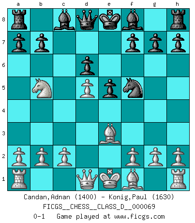 Last move : 0-1 2008 January 7 22:50:53 [Event "FICGS__CHESS__CLASS_D__000069"] [Site "FICGS"] [Date "2007.11.20"] [Round "1"] [White "Candan,Adnan"] [Black "Konig,Paul"] [Result "0-1"] [WhiteElo "1400"] [BlackElo "1630"] 1.e4 c5 2.Nf3 Nc6 3.d4 cxd4 4.Nxd4 Nf6 5.Nc3 e5 6.Ndb5 d6 7.Nd5 Nxd5 8.exd5 Ne7 9.Be3 Nf5 0-1 This chess game has been lost on time (started : 2007.11.20 8:9:49) Sicilian : Pelikan (Lasker/Sveshnikov) variation Player Black won this chess game. Follow this game move after move (download)It was clear to me that the vulnerable point of the American Grandmaster (Bobby Fischer) was in double-edged, hanging, irrational positions, where he often failed to find a win even in a won position. (Efim Geller) Ich trinke, ich rauche, ich spiele, ich liebe Frauen aber Fernschach ist ein Laster, das ich nicht habe. (Mikhail Nekhemyevich Tal) De eso se trata el Ajedrez. Un día le das una lección a tu oponente y al día siguiente el te da una a tí. (Bobby Fischer) Les écrivains ont utilisé les échecs pour analyser les côtés extrêmes de la nature humaine. Dans ce cadre, les échecs offrent un champ d'expérimentation idéal. Mais on pourrait faire la même chose avec la peinture. Et là, en vous référant à Van Gogh, vous ne tirerez pas de conclusion définitive sur les peintres. (Gary Kasparov) Life is like a ten-speed bicycle: most of us have gears we never use. (Charles M. Schulz)