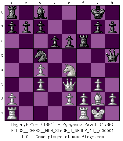 Last move : 1-0 2006 August 22 6:29:44 [Event "FICGS__CHESS__WCH_STAGE_1_GROUP_11__000001"] [Site "FICGS"] [Date "2006.07.01"] [Round "1"] [White "Unger,Peter"] [Black "Zyryanov,Pavel"] [Result "1-0"] [WhiteElo "1884"] [BlackElo "1736"] 1.d4 Nf6 2.c4 e6 3.Nf3 Be7 4.d5 O-O 5.Nc3 Bb4 6.g3 Ne4 7.Bd2 Bxc3 8.Bxc3 Nxc3 9.bxc3 d6 10.Bg2 Nd7 11.dxe6 fxe6 12.O-O Nc5 13.Qd2 Qe8 14.Qe3 Rf6 15.Nd2 Qh5 16.Ne4 1-0 This chess game has been lost on time (started : 2006.07.01 16:14:28) Queen's pawn game Kingside Castling by player Black (move 4) Kingside Castling by player White (move 12) Player White won this chess game. Follow this game move after move (download)There are two classes of men; those who are content to yield to circumstances and who play whist; those who aim to control circumstances, and who play Chess. (Mortimer Collins) Du musst nicht gut spielen, es reicht, wenn du besser spielst als dein Gegner. (Anonymous) Todo se encuentra en un estado de flujo y esto incluye al mundo del Ajedrez. (Mikhail Botvinnik) Soyez une menace à chaque fois que vous vous asseyez pour jouer. (Ken Smith) Chess is as much a mystery as women. (Purdy)