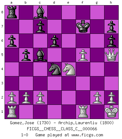 Last move : 1-0 2007 December 14 20:15:23 [Event "FICGS__CHESS__CLASS_C__000066"] [Site "FICGS"] [Date "2007.11.20"] [Round "1"] [White "Gomez,Jose"] [Black "Archip,Laurentiu"] [Result "1-0"] [WhiteElo "1730"] [BlackElo "1800"] 1.e4 e5 2.Nf3 Nc6 3.Bb5 a6 4.Ba4 Qe7 5.Nc3 b5 6.Bb3 Nf6 7.O-O Qd8 8.d4 exd4 9.Ng5 Ne5 10.Qxd4 Bd6 11.f4 Nc6 12.Qd1 O-O 13.e5 Bc5+ 14.Kh1 d6 15.exf6 Qxf6 16.Nce4 Qh6 17.f5 Nd4 18.Nxf7 Rxf7 19.Bxf7+ Kxf7 20.Bxh6 gxh6 21.Qh5+ 1-0 Ruy Lopez Kingside Castling by player White (move 7) Kingside Castling by player Black (move 12) Player White won this chess game. Follow this game move after move (download)All I want to do, ever, is just play Chess. (Bobby Fischer) Capablanka war das größte Genie der Schachgeschichte! Aber denken sie nicht er habe nichts vom Schach verstanden. Er wusste nur soviel wie er wissen musste um seine Ziele zu erreichen. (Mikhail Moiseyevich Botvinik) Del Ajedrez se ha dicho que la vida no es lo suficientemente larga para él, pero eso es culpa de la vida, no del Ajedrez. (William Ewart Napier) Aidez vos pièces, elles vous aideront. (Paul Morphy) Somewhere in the world there is an epigram for every dilemma. (Hendrik Willem van Loon)