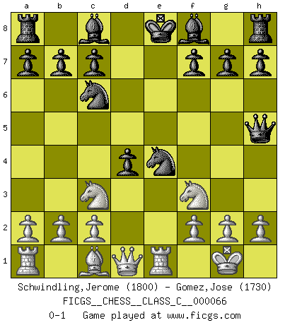 Last move : 0-1 2008 January 8 22:57:46 [Event "FICGS__CHESS__CLASS_C__000066"] [Site "FICGS"] [Date "2007.11.20"] [Round "1"] [White "Schwindling,Jerome"] [Black "Gomez,Jose"] [Result "0-1"] [WhiteElo "1800"] [BlackElo "1730"] 1.e4 e5 2.Nf3 Nc6 3.d4 exd4 4.Bc4 Nf6 5.O-O Nxe4 6.Re1 d5 7.Bxd5 Qxd5 8.Nc3 Qh5 0-1 This chess game has been lost on time (started : 2007.11.20 21:14:43) Scotch gambit : Dubois-Reti defense Kingside Castling by player White (move 5) Player Black won this chess game. Follow this game move after move (download)Chess holds its master in its own bonds, shackling the mind and brain so that the inner freedom of the very strongest must suffer. (Albert Einstein) Der vorletzte Fehler gewinnt. (Savielly Grigorievitsch Tartakower) El Ajedrez es el juego mas altamente simbólico, pero las agresiones estan por lo tanto aún mas francamente representadas en la partida. Tal vez comenzo como un juego de guerra; Algo como la representación de una batalla en miniatura entre las fuerzas de dos reinos. (Karl Meninger) Le jeu d'échecs est comme rejeté hors du temps. (Antoine de Saint-Exupéry) If you know the enemy and know yourself you need not fear the results of a hundred battles. (Sun Tzu)