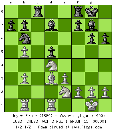 Last move : 1/2-1/2 2006 July 5 21:14:20 [Event "FICGS__CHESS__WCH_STAGE_1_GROUP_11__000001"] [Site "FICGS"] [Date "2006.07.01"] [Round "1"] [White "Unger,Peter"] [Black "Yuvarlak,Ugur"] [Result "1/2-1/2"] [WhiteElo "1884"] [BlackElo "1400"] 1.d4 Nf6 2.Nf3 e6 3.c4 d5 4.Nc3 c6 5.Bg5 h6 6.Bxf6 Qxf6 7.e3 Nd7 8.Qc2 g6 9.cxd5 exd5 10.Bd3 Bg7 11.O-O O-O 12.b4 Qd6 13.Rab1 Nb6 14.Rfc1 Be6 15.b5 c5 16.dxc5 Qxc5 17.Ne2 Qa3 18.Nfd4 Rac8 19.Qb3 Qxb3 20.axb3 Bd7 21.Rd1 1/2-1/2 Queen's pawn game Kingside Castling by player White (move 11) Kingside Castling by player Black (move 11) This chess game ended in a draw. Follow this game move after move (download)Dazzling combinations are for the many, shifting wood is for the few. (Georg Kieninger) Auf Remis zu spielen ist gewissermaßen ein Verbrechen gegen das Schachspiel. (Mikhail Nekhemyevich Tal) Solo puedes ser bueno en el Ajedrez si amas al juego. (Bobby Fischer) C'est une question de caractère, Beaucoup de gens perdent leur motivation très vite. D'autres, ils sont rares, peuvent la conserver très longtemps. J'aime les échecs, encore aujourd'hui je suis heureux d'analyser des parties. J'aime toujours gagner, je déteste encore perdre. Bien jouer est important pour mon intégrité intellectuelle et morale. Et puis les échecs vivent en ce moment une période historique grâce à Internet. Ils se développent dans les systèmes éducatifs à travers le monde. Ils sortent de leur ghetto, et c'est mon rôle de mener à bien cette révolution. (Gary Kasparov) The large trees attract high winds. (Chinese proverb)