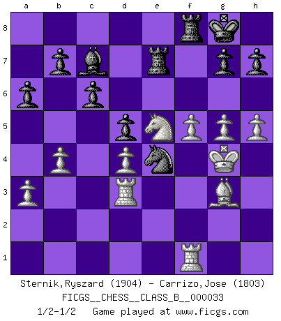 Last move : 1/2-1/2 2008 March 1 14:25:49 [Event "FICGS__CHESS__CLASS_B__000033"] [Site "FICGS"] [Date "2007.11.22"] [Round "1"] [White "Sternik,Ryszard"] [Black "Carrizo,Jose"] [Result "1/2-1/2"] [WhiteElo "1904"] [BlackElo "1803"] 1.e4 e5 2.Nf3 Nc6 3.d4 exd4 4.Bc4 Bc5 5.c3 Nf6 6.e5 d5 7.Bb5 Ne4 8.cxd4 Bb6 9.O-O O-O 10.Nc3 Bg4 11.Be3 f6 12.exf6 Nxf6 13.Be2 Ne7 14.Ne5 Bxe2 15.Qxe2 c6 16.Qd3 Qd6 17.f4 Qb4 18.a3 Qb3 19.f5 Rae8 20.Rae1 Ne4 21.g4 Nc8 22.Rd1 Ncd6 23.Nxe4 Qxd3 24.Rxd3 Nxe4 25.Kg2 Re7 26.b4 Bc7 27.Bf4 Rfe8 28.h4 a6 29.Kh3 Bd6 30.g5 Rf8 31.Kg4 Bc7 32.h5 Nd6 33.Bg3 Ne4 1/2-1/2 Scotch gambit Kingside Castling by player White (move 9) Kingside Castling by player Black (move 9) This chess game ended in a draw. Follow this game move after move (download)Chess is above all, a fight ! (Emanuel Lasker) Ein bischen Romantik kann weder im Schach noch in der Liebe schaden. Also versuche ich mich ab und zu daran zu erinnern. (Nigel Short) Yo nunca en mi vida he jugado la Defensa Francesa, que viene siendo la más aburrida de todas las Aperturas. (Wilhelm Steinitz) Donnez-moi un Cavalier en 6e et je gagnerais toutes mes parties. (Steinitz) A specialist learns more and more about less and less until he knows everything about nothing. (Nicholas Murray Butler)