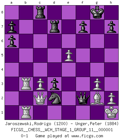 Last move : 0-1 2006 August 15 1:7:23 [Event "FICGS__CHESS__WCH_STAGE_1_GROUP_11__000001"] [Site "FICGS"] [Date "2006.07.01"] [Round "1"] [White "Jaroszewski,Rodrigo"] [Black "Unger,Peter"] [Result "0-1"] [WhiteElo "1200"] [BlackElo "1884"] 1.d4 Nf6 2.c4 e6 3.Nc3 Bb4 4.Qc2 O-O 5.e4 d5 6.e5 Ne4 7.Bd3 c5 8.cxd5 exd5 9.Nge2 cxd4 10.Nxd4 Nd7 11.f4 Qh4+ 12.g3 Qh3 13.Bf1 Qh5 14.Bg2 Nb6 15.O-O Bxc3 16.bxc3 Bf5 17.Nxf5 Qxf5 18.a4 Rad8 19.Rb1 Rd7 20.a5 Nc4 21.Rd1 Rfd8 22.a6 bxa6 23.Bf1 g5 24.Re1 Rc8 25.Rb3 gxf4 26.Bxf4 Ncd2 27.Bxd2 Qf2+ 28.Kh1 Nxd2 29.Reb1 d4 30.Bg2 d3 0-1 Nimzo-Indian : Classical variation Kingside Castling by player Black (move 4) Kingside Castling by player White (move 15) Player Black won this chess game. Follow this game move after move (download)By playing at Chess then, we may learn: First: Foresight... Second: Circumspection... Third: Caution... And lastly, we learn by Chess the habit of not being discouraged by present bad appearances in the state of our affairs, the habit of hoping for a favorable chance, and that of persevering in the secrets of resources. (Benjamin Franklin) Ich hatte Zahnschmerzen im ersten Spiel. In der zweiten Partie tat mir der Kopf weh. In der dritten war es eine Rheuma-Attacke und während der vierten fühlte ich mich nicht gut. Und in der fünften? Nun, man muss doch nicht jedes Spiel gewinnen, oder? (Savielly Grigorievitsch Tartakower) El Ajedrez es un expediente tonto que hace creer a la gente inactiva que hacen una cosa muy astuta cuando solamente estan perdiendo su tiempo. (George Bernard Shaw) Mon pion favori sur ma case favorite ! Bronstein en parlant d'un coup de pion en h5 quand il avait les Noirs. The Internet is the world's largest library. It's just that all the books are on the floor. (John Allen Paulos)
