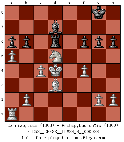 Last move : 1-0 2008 May 12 9:41:1 [Event "FICGS__CHESS__CLASS_B__000033"] [Site "FICGS"] [Date "2007.11.22"] [Round "1"] [White "Carrizo,Jose"] [Black "Archip,Laurentiu"] [Result "1-0"] [WhiteElo "1803"] [BlackElo "1800"] 1.e4 e5 2.Nf3 Nc6 3.Bb5 Bd6 4.O-O Nf6 5.d4 exd4 6.e5 Nxe5 7.Nxe5 Bxe5 8.Re1 O-O 9.Rxe5 c6 10.Bd3 d6 11.Re1 Bg4 12.f3 Bd7 13.Bg5 h6 14.Bf4 d5 15.Be5 c5 16.Bd6 Re8 17.Rxe8+ Qxe8 18.Bxc5 Qe5 19.Qd2 b6 20.f4 Qe3+ 21.Qxe3 dxe3 22.Bxe3 Re8 23.Bf2 Ne4 24.a4 Nxf2 25.Kxf2 Re6 26.Nc3 Rf6 27.Nxd5 Rd6 28.c4 a6 29.Ke3 g6 30.Kd4 f6 31.a5 1-0 Ruy Lopez (Spanish Opening) Kingside Castling by player White (move 4) Kingside Castling by player Black (move 8) Player White won this chess game. Follow this game move after move (download)Bobby Fischer is the greatest Chess player who has ever lived. (Ken Smith) Unter Putin wird alles Geld aus Russland wie von einem Staubsauger nach Moskau umgeleitet, das ist wie ein schwarzes Loch. (Garry Kasparov) El pensamiento metódico es mas útil en el Ajedrez que la inspiración. (C. J. S. Purdy) Lorsque vous vous retrouvez devant une position atroce, ne tendez pas un ultime piège dérisoire avec l'intention d'abandonner si l'adversaire le déjoue ! Faites-vous plutôt un devoir de résister comme si votre vie en dépendait. Jouez le coup qui vous déplairait au centuple si vous étiez dans la peau de votre tortionnaire ! Luck is what you have left over after you give 100 percent. (Langston Coleman)