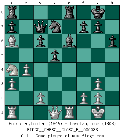 Last move : 0-1 2008 April 14 19:45:10 [Event "FICGS__CHESS__CLASS_B__000033"] [Site "FICGS"] [Date "2007.11.22"] [Round "1"] [White "Boissier,Lucien"] [Black "Carrizo,Jose"] [Result "0-1"] [WhiteElo "1846"] [BlackElo "1803"] 1.e4 e5 2.Nf3 Nc6 3.d4 exd4 4.Nxd4 Nf6 5.Nc3 Bb4 6.Nxc6 bxc6 7.Bd3 d5 8.exd5 cxd5 9.O-O O-O 10.Bg5 c6 11.Rfe1 h6 12.Bh4 Be6 13.a3 Be7 14.b4 Re8 15.Na4 Nd7 16.Bg3 Bh4 17.Ba6 Bxg3 18.hxg3 Qc7 0-1 This chess game has been lost on time (started : 2007.11.22 12:41:45) Scotch : Schmidt variation Kingside Castling by player White (move 9) Kingside Castling by player Black (move 9) Player Black won this chess game. Follow this game move after move (download)The hallmark of the artist is simplicity. (Larry Evans) Ja, jede Frau in Holland liebt mich bestimmt, und alle Männer hassen mich. (Loek van Wely) Bobby Fischer es el jugador de Ajedrez mas grande que jamás haya existido. (Ken Smith) Les échecs sont plus proches de l'art de l'assassinat que de l'art de la guerre. (Arturo Perez-Reverte) Happy endings are just stories that haven't finished yet. (Jane Smith in Mr & Mrs Smith)