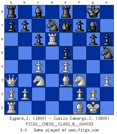 Last move : 1-0 2008 February 10 1:1:49 [Event "FICGS__CHESS__CLASS_B__000033"] [Site "FICGS"] [Date "2007.11.22"] [Round "1"] [White "Eygard,John"] [Black "Cuello Camargo,Jose Javier"] [Result "1-0"] [WhiteElo "1800"] [BlackElo "1800"] 1.c4 g6 2.Nc3 Bg7 3.Nf3 Nf6 4.d4 O-O 5.e4 d6 6.Be2 e5 7.dxe5 dxe5 8.Bg5 Nbd7 9.O-O c6 10.Qd6 h6 11.Be3 Ng4 12.Bd2 Qf6 13.Qa3 Qe6 14.h3 Ngf6 15.Be3 Re8 16.Rfd1 Nh5 17.Rd6 Qe7 18.Bf1 1-0 English Opening Kingside Castling by player Black (move 4) Kingside Castling by player White (move 9) Player White won this chess game. Follow this game move after move (download)Combinations have always been the most intriguing aspect of Chess. The masters look for them, the public applauds them, the critics praise them. It is because combinations are possible that Chess is more than a lifeless mathematical exercise. They are the poetry of the game; they are to Chess what melody is to music. They represent the triumph of mind over matter. (Reuben Fine) Was ist der Unterschied zwischen einem Strassenarbeiter und einem Schachspieler? --Der Schachspieler bewegt sich ab und zu. (Anonymous) Entre mas años cumplo, mas valoro los Peones. (Keres) Je ne suis pas le dernier à jouer lâchement des coups douteux pendant le zeïtnot de l'adversaire pour l'achever: en effet les coups qui font le plus peur sont ceux que l'on ne comprend pas. Je me fais souvent peur quand je joue. (Un professeur anonyme) I don't believe in psychology. I believe in good moves. (Bobby Fischer)