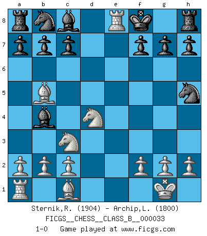 Last move : 1-0 2007 November 29 20:5:28 [Event "FICGS__CHESS__CLASS_B__000033"] [Site "FICGS"] [Date "2007.11.22"] [Round "1"] [White "Sternik,Ryszard"] [Black "Archip,Laurentiu"] [Result "1-0"] [WhiteElo "1904"] [BlackElo "1800"] 1.e4 e5 2.Nf3 d5 3.exd5 Qxd5 4.Nc3 Qc5 5.d4 exd4 6.Nxd4 Qe5+ 7.Be2 Bb4 8.O-O Nf6 9.Bb5+ Kf8 10.Re1 Qh5 11.Qxh5 Nxh5 12.Re8+ 1-0 QP counter-gambit (elephant gambit) Kingside Castling by player White (move 8) Player White won this chess game. Follow this game move after move (download)You are for me the Queen on d8 and I am the Pawn on d7 !! (Eduard Gufeld) Ein Teil des Fehlers ist immer korrekt. (Savielly Grigorievitsch Tartakower) Aún el Rey más flojo huye despavorido ante la amenaza de un Jaque doble. (Aaron Nimzowitsch) Fischer est le meilleur joueur du monde et Karpov n'est qu'un joueur de bistrot. (Garry Kasparov, agé de 16 ans) Knowledge rests not upon truth alone, but upon error also. (Carl G. Jung)