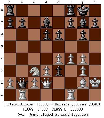 Last move : 0-1 2008 February 16 13:33:54 [Event "FICGS__CHESS__CLASS_B__000033"] [Site "FICGS"] [Date "2007.11.22"] [Round "1"] [White "Potaux,Olivier"] [Black "Boissier,Lucien"] [Result "0-1"] [WhiteElo "2000"] [BlackElo "1846"] 1.e4 c5 2.Nc3 Nc6 3.g3 g6 4.Bg2 Bg7 5.d3 d6 6.Nge2 Nf6 7.h3 O-O 8.Be3 Bd7 9.Qd2 Qb6 10.O-O Nd4 11.f4 e6 12.Kh2 Qxb2 13.Nxd4 Ng4+ 14.hxg4 cxd4 15.Rab1 dxe3 0-1 Sicilian : Closed Kingside Castling by player Black (move 7) Kingside Castling by player White (move 10) Player Black won this chess game. Follow this game move after move (download)By this measure (on the gap between Fischer & his contemporaries), I consider him the greatest world champion. (Garry Kasparov) Der Verteidiger gebe der Gewalt nach, aber nur der Gewalt. Er schaffe sich nicht freiwillig, etwa aus Blindheit oder aus Schrecken, irgendwelche Schwächen. Er lasse sich nicht bluffen. (Emanuel Lasker) Bobby Fischer es el jugador de Ajedrez mas grande que jamás haya existido. (Ken Smith) Il n'y a pas de prix trop élevé au scalp de l'ennemi. (Koblentz) I find your interest interesting. (Gregory House, House M.D.)