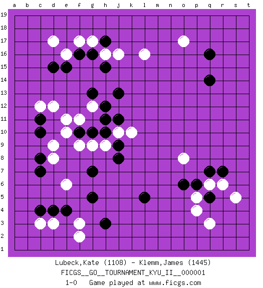 Last move : 1-0 2008 March 9 15:53:8 [Event "FICGS__GO__TOURNAMENT_KYU_II__000001 "] [Site "FICGS"] [Date "2007.11.22"] [Round "1"] [Black "Lubeck,Kate "] [White "Klemm,James "] [Result "1-0"] [Rating 1 "1108"] [Rating 2 "1445"] 1.q16 d17 2.d4 q3 3.q5 p5 4.p6 p4 5.o6 q6 6.q7 r6 7.r7 s5 8.l5 o17 9.q14 l16 10.d15 c12 11.c10 f3 12.h3 c3 13.c4 d3 14.e4 f2 15.g5 e11 16.f10 e10 17.f16 f17 18.g16 g17 19.h17 h16 20.h15 j16 21.j13 e16 22.e15 d8 23.c8 d9 24.c7 f9 25.g10 g9 26.h10 g12 27.c11 h9 28.j9 j10 29.j11 k10 30.h12 o8 31.j8 d12 32.g13 e6 33.g7 f11 34.h11 1-0 This go game has been lost on time (started : 2007.11.22 14:29:50) Here are the names of the openings (joseki) played in the four corners : Corner q4 : q3 q5Komoku (Somok, Xiao~mu`) 3-4 Point. The komoku (3-4) point is the traditional corner enclosure move..Ikken Takagakari (Hankan Nop'dakeolch'im, Yi Gaogua`jiao~, 1-Space High Approach). The 5-4 approach move has become more popular in modern times, as modern Go emphasizes speed and influence. Corner q16 : q16 o17Hoshi (Hwajeom, Seongjeom, Xingwei`) 4-4 Point. The star or hoshi (4-4) point, emphasizing influence at the potential expense of territory.Ikken Kakari (Hankan Keolch'im, Yi Gua`jiao~, 1-Space Low Approach). White 2 is the standard approach move to the 4-4. Corner d16 : d17 d15Komoku (Somok, Xiao~mu`) 3-4 Point. The komoku (3-4) point is the traditional corner enclosure move..Ikken Takagakari (Hankan Nop'dakeolch'im, Yi Gaogua`jiao~, 1-Space High Approach). The 5-4 approach move has become more popular in modern times, as modern Go emphasizes speed and influence. Corner d4 : d4 f3Hoshi (Hwajeom, Seongjeom, Xingwei`) 4-4 Point. The star or hoshi (4-4) point, emphasizing influence at the potential expense of territory.Ikken Kakari (Hankan Keolch'im, Yi Gua`jiao~, 1-Space Low Approach). White 2 is the standard approach move to the 4-4. Player Black won this Go (weiqi, baduk) game.Follow this game move after move (download ) Do not fear furikawari. (Anonymous) I don't know, I don't care, and it doesn't make any difference. (Albert Einstein)