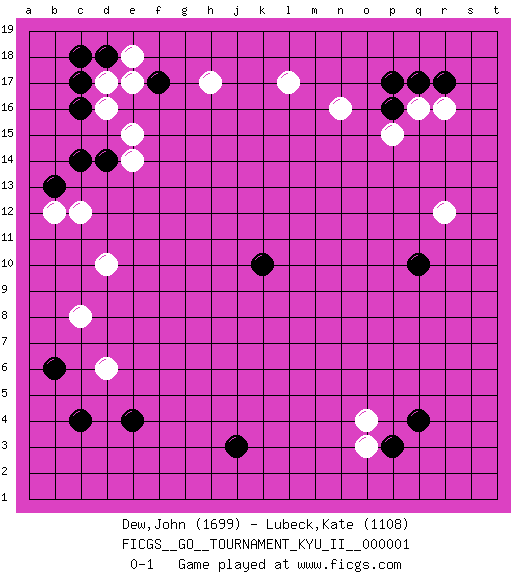 Last move : 0-1 2008 January 24 23:39:41 [Event "FICGS__GO__TOURNAMENT_KYU_II__000001"] [Site "FICGS"] [Date "2007.11.22"] [Round "1"] [Black "Dew,John"] [White "Lubeck,Kate"] [Result "0-1"] [Rating 1 "1699"] [Rating 2 "1108"] 1.q4 d16 2.c4 r16 3.j3 l17 4.q10 d10 5.k10 d6 6.e4 r12 7.c14 c12 8.f17 e15 9.c17 d17 10.c16 h17 11.d18 e18 12.c18 e17 13.b13 b12 14.d14 e14 15.b6 c8 16.p16 n16 17.r17 q16 18.q17 p15 19.p17 o3 20.p3 o4 0-1 This go game has been lost on time (started : 2007.11.22 14:29:50) Here are the names of the openings (joseki) played in the four corners : Corner d16 : d16 c14 Hoshi (Hwajeom, Seongjeom, Xingwei`) 4-4 Point. The star or hoshi (4-4) point, emphasizing influence at the potential expense of territory. Ikken Kakari (Hankan Keolch'im, Yi Gua`jiao~, 1-Space Low Approach). Black 2 is the standard approach move to the 4-4. Corner q4 : q4 o3 Hoshi (Hwajeom, Seongjeom, Xingwei`) 4-4 Point. The star or hoshi (4-4) point, emphasizing influence at the potential expense of territory. Ikken Kakari (Hankan Keolch'im, Yi Gua`jiao~, 1-Space Low Approach). White 2 is the standard approach move to the 4-4. Player White won this Go (weiqi, baduk) game. Follow this game move after move (download)If a formation is symmetrical, play at the center. (Anonymous) If you have any trouble condescending, find a Unix user to show you how it's done. (Scott Adams)
