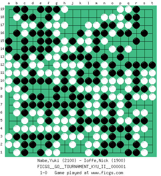 Last move : 1-0 2008 January 15 13:53:12 [Event "FICGS__GO__TOURNAMENT_KYU_II__000001"] [Site "FICGS"] [Date "2007.11.22"] [Round "1"] [Black "Nabe,Yuki"] [White "Ioffe,Nick"] [Result "1-0"] [Rating 1 "2100"] [Rating 2 "1900"] 1.q16 d17 2.q3 d4 3.r9 c11 4.f3 h3 5.c3 c4 6.d3 e4 7.f2 g5 8.k16 d15 9.k10 q5 10.r5 p3 11.p2 q2 12.o2 r3 13.q4 r4 14.p4 p5 15.o4 r6 16.r12 q14 17.p14 q17 18.p16 r16 19.r15 p17 20.s16 o16 21.r17 o14 22.p13 m17 23.n16 n15 24.o17 o18 25.n17 n18 26.m16 l16 27.m15 l15 28.m14 l17 29.d18 e18 30.e17 c17 31.f18 f17 32.e16 g18 33.e19 g17 34.c18 b18 35.d16 c16 36.c15 b15 37.c14 b14 38.d14 g14 39.f14 g13 40.c12 b12 41.b13 a13 42.c13 b11 43.e10 e12 44.e13 f15 45.e15 f13 46.e14 d12 47.c19 g10 48.g8 f11 49.g9 j10 50.j9 k9 51.h10 j11 52.k8 l9 53.j8 l11 54.h11 j12 55.f10 g11 56.e8 b4 57.b3 c8 58.f6 f4 59.c7 b7 60.d7 b6 61.h6 n3 62.o3 l4 63.j4 j3 64.k4 k3 65.l5 m4 66.s5 s6 67.r2 s2 68.q1 s4 69.m5 h4 70.n4 m2 71.m10 m9 72.l10 n10 73.m11 n11 74.m12 n12 75.n13 o8 76.o12 q10 77.r10 q11 78.q12 s11 79.r11 q9 80.p9 p8 81.q8 r8 82.q7 o9 83.k13 l14 84.l13 j14 85.k14 k15 86.j13 h12 87.j15 h14 88.f16 g16 89.g15 h15 90.g19 h19 91.f19 h17 92.c9 b9 93.c10 s8 94.s9 n6 95.n5 l7 96.o6 p6 97.n7 m7 98.o7 p7 99.k6 m6 100.o5 g2 101.e3 f1 102.e1 g1 103.g3 j2 104.b10 a10 105.d8 b8 106.r18 q19 107.q18 p18 108.b19 t9 109.t10 t8 110.b16 a12 111.d11 e11 112.d10 b2 113.c1 a3 114.c2 a2 115.d2 g6 116.g7 a9 117.a15 j5 118.k5 j6 119.j7 h5 120.a14 a11 121.o11 o10 122.p11 p10 123.n8 n9 124.n2 m3 125.r19 s10 126.s12 t11 127.t12 t10 128.m1 l2 129.h9 e6 130.f7 d6 131.k11 k12 132.l12 s1 133.r1 p19 134.h13 g12 135.c6 c5 136.f5 e5 137.h7 l1 138.n1 b1 139.f15 g4 140.l8 m8 141.k7 d13 142.e7 l6 143.pass 1-0 Here are the names of the openings (joseki) played in the four corners : Corner d4 : d4 f3 Hoshi (Hwajeom, Seongjeom, Xingwei`) 4-4 Point. The star or hoshi (4-4) point, emphasizing influence at the potential expense of territory. Ikken Kakari (Hankan Keolch'im, Yi Gua`jiao~, 1-Space Low Approach). Black 2 is the standard approach move to the 4-4. Player Black won this Go (weiqi, baduk) game. Follow this game move after move (download)Keshi is worth as much as an invasion ! (Anonymous) Statistics can be made to prove anything - even the truth. (Author unknown)